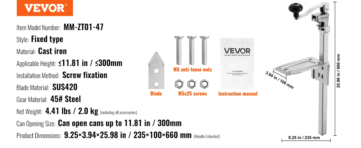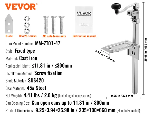 VEVOR Abrelatas, Abrelatas Manual de Sobremesa de Hierro Fundido para Latas de hasta 30 cm de Altura, Altura Ajustable, con Cuchilla de Acero Inoxidable, para Restaurantes, 235 x 100 x 660 mm