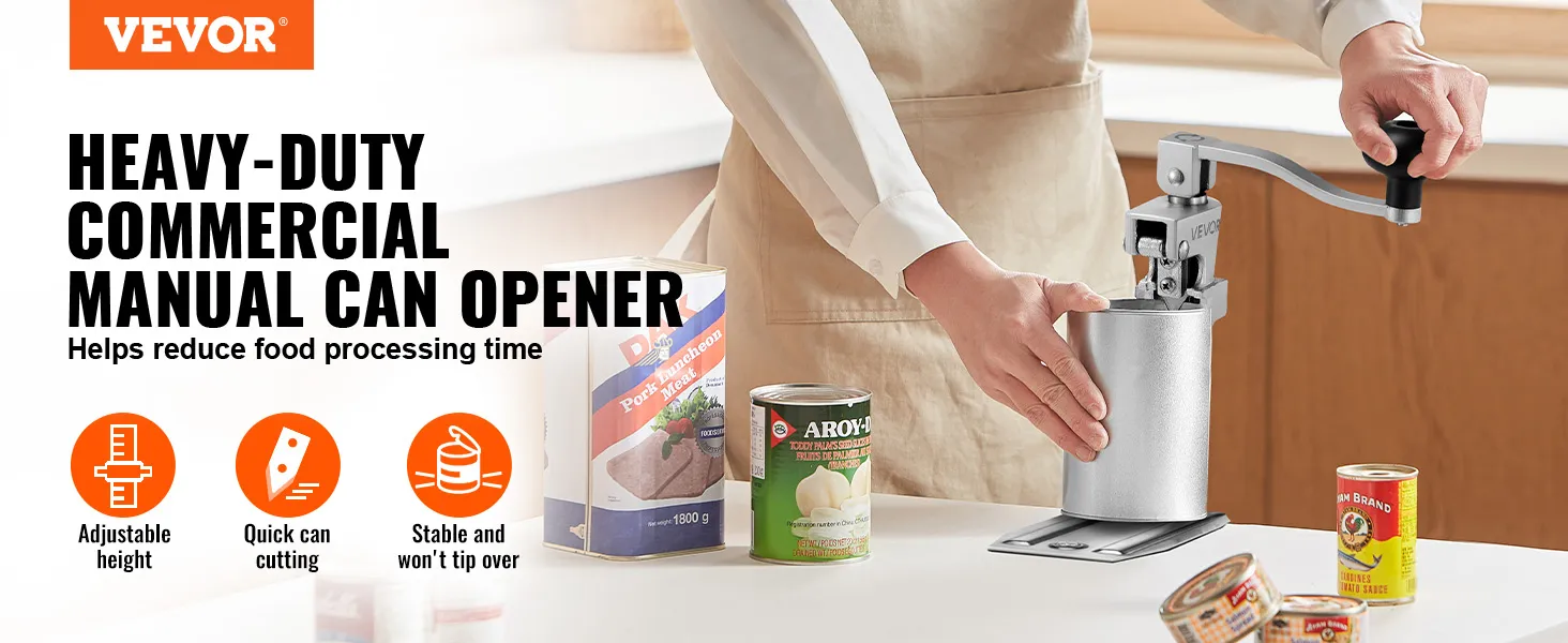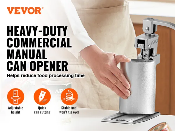Materiales de alta calidad: Este abrelatas de mesa comercial cuenta con hojas dobles SUS420, engranajes de acero n.° 45, una base de hierro fundido y un mango ergonómico para un corte nítido, estabilidad y comodidad a largo plazo sin problemas de óxido