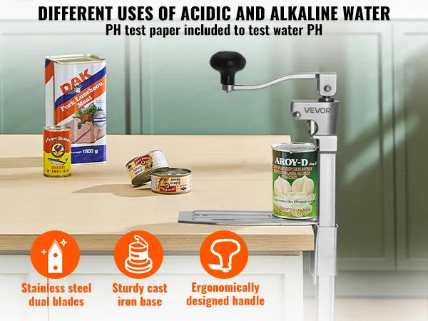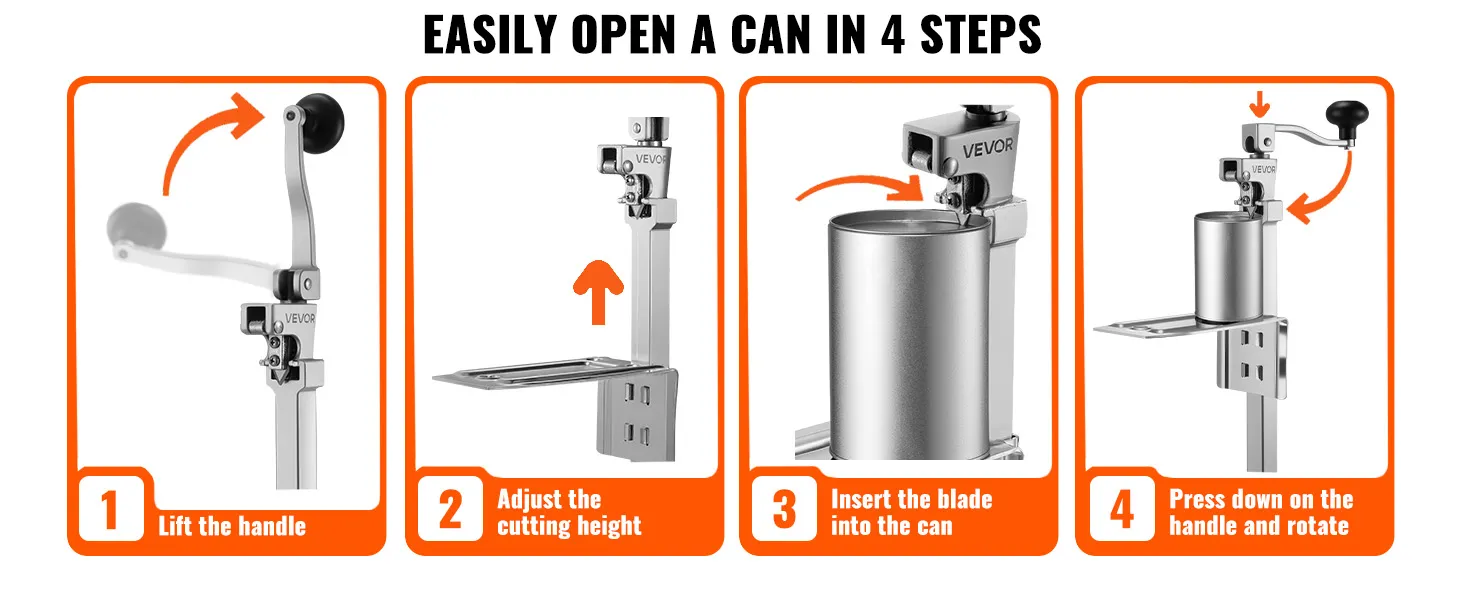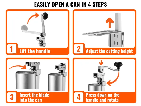 Fácil de usar: Simplemente, coloque la lata, ajuste la altura, baje la cuchilla y el mango, y luego gire para abrirla en 4 sencillos pasos. Incluso los principiantes pueden usar fácilmente este robusto abrelatas