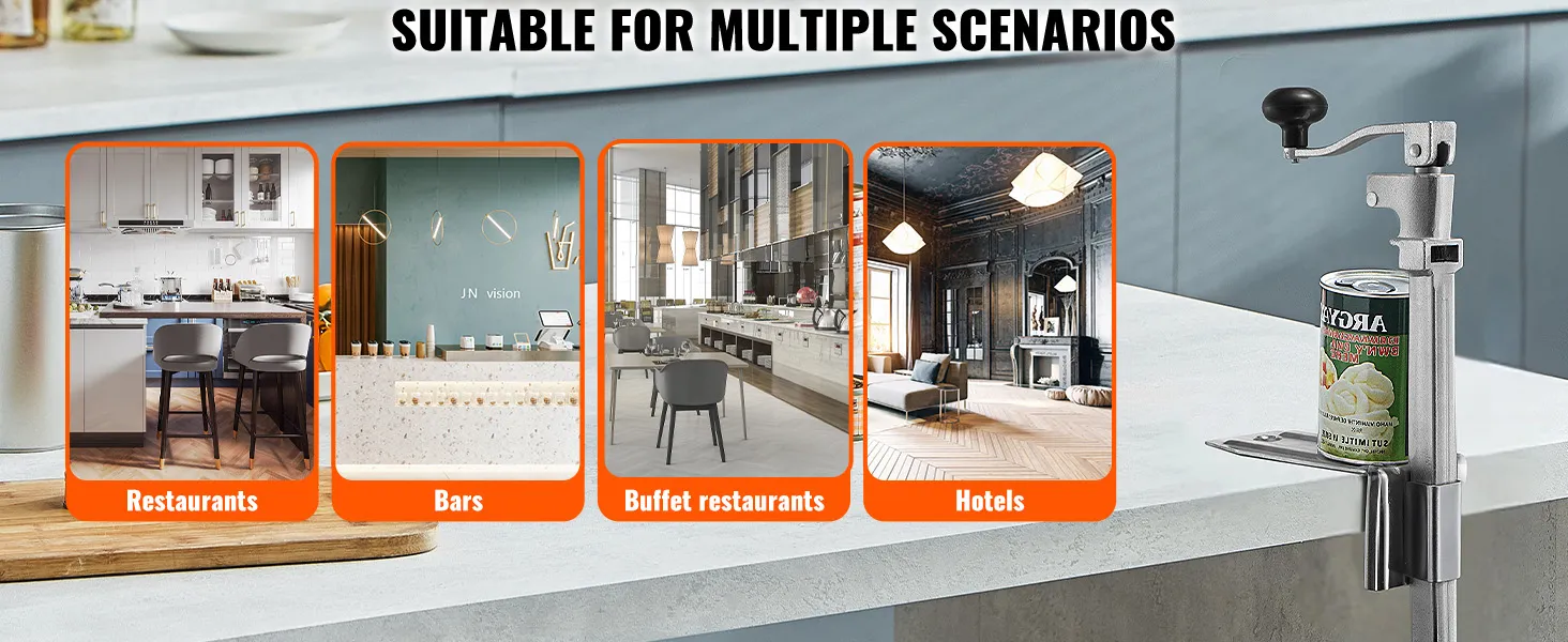 Amplias aplicaciones: Este abrelatas se usa ampliamente en bares, hoteles, restaurantes, cocinas comerciales, barcos y aplicaciones militares, lo que lo hace extremadamente versátil para el uso diario