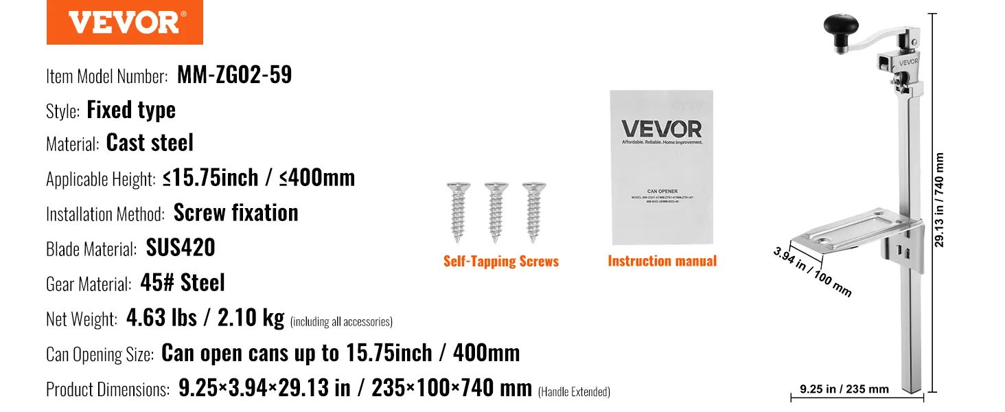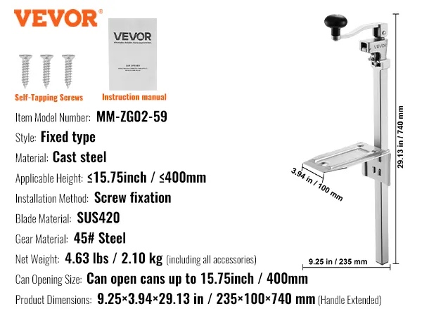 VEVOR Abrelatas, Abrelatas Manual de Sobremesa para Latas de hasta 40 cm de Altura, Acero Fundido, Altura Ajustable con Tornillos, para Restaurantes y Tiendas de Comestibles, 235 x 100 x 740 mm