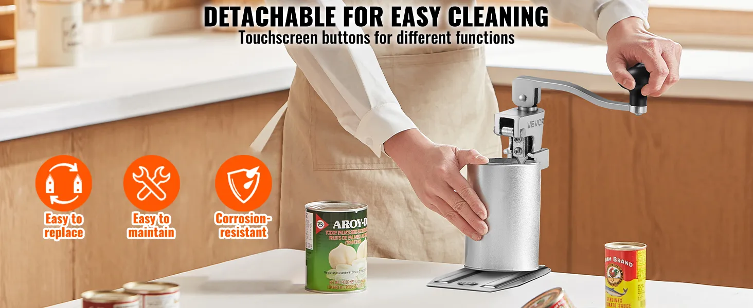 Fácil de limpiar: La cuchilla y el engranaje se pueden quitar para reemplazarlos y limpiarlos sin esfuerzo, lo que simplifica el mantenimiento y garantiza la higiene de los alimentos con este abrelatas industrial