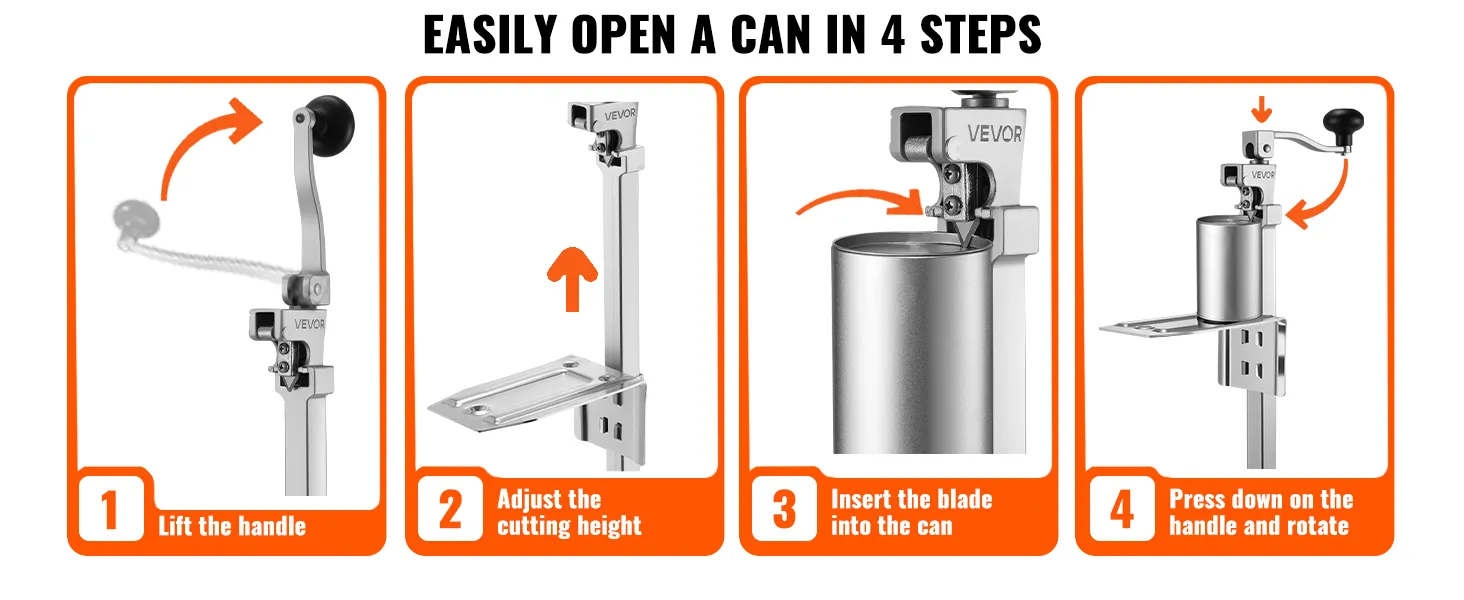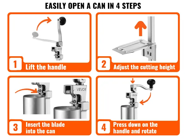 Fácil de usar: Simplemente, coloque la lata, ajuste la altura, baje la cuchilla y el mango, y luego gire para abrirla en 4 sencillos pasos. Incluso los principiantes pueden usar fácilmente este robusto abrelatas