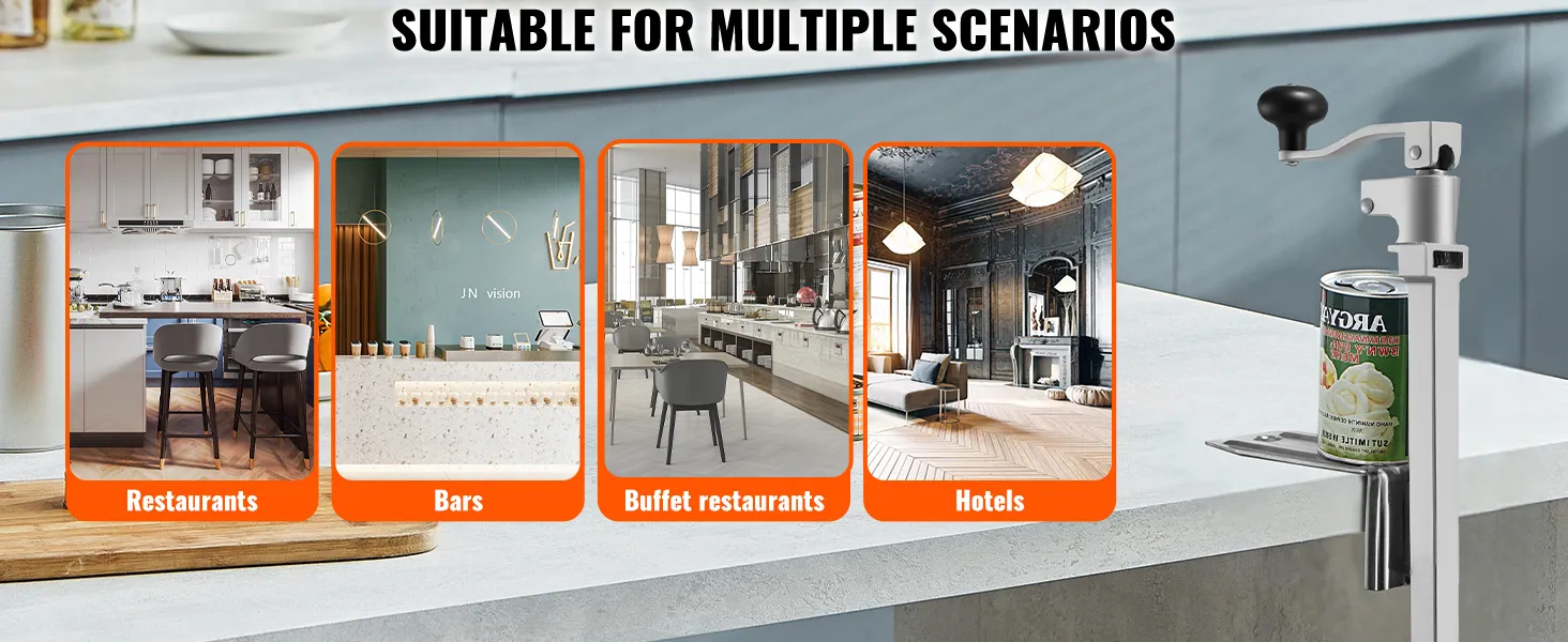 Amplias aplicaciones: Este abrelatas se usa ampliamente en bares, hoteles, restaurantes, cocinas comerciales, barcos y aplicaciones militares, lo que lo hace extremadamente versátil para el uso diario