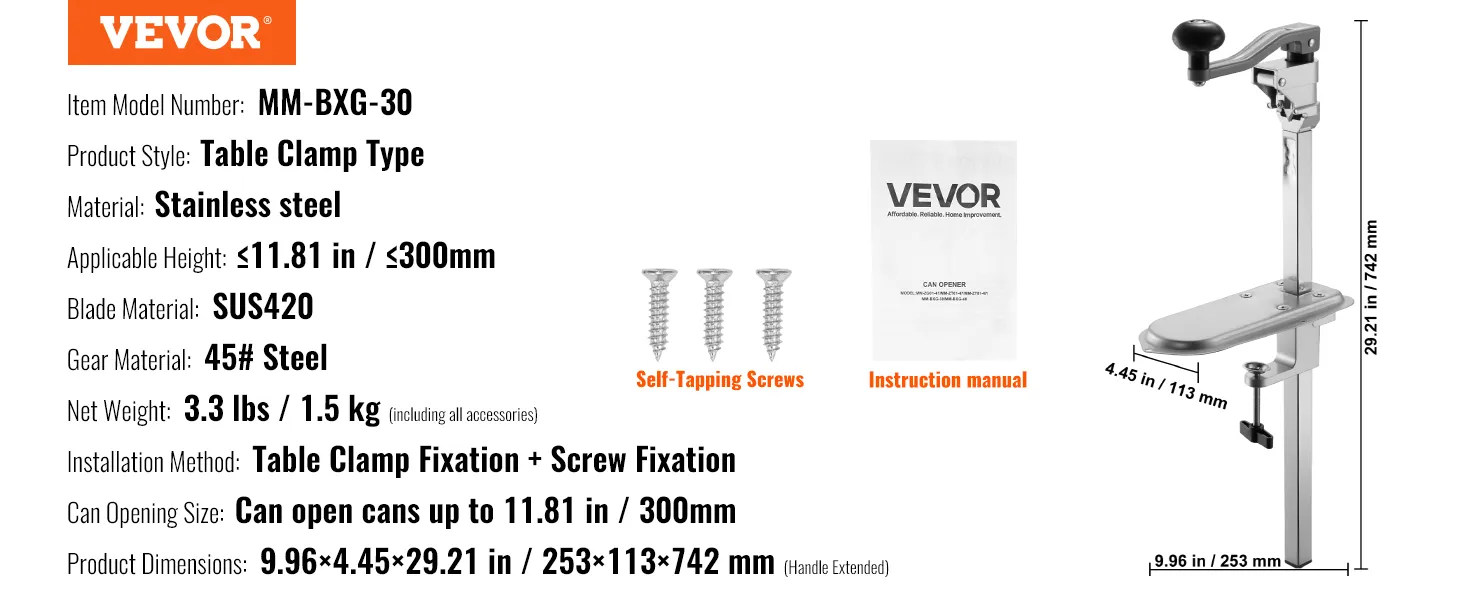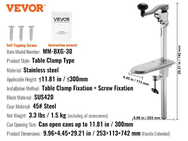 VEVOR Abrelatas Duradero Manual de Sobremesa para Latas de hasta 30 cm de Altura, Altura Ajustable, con Tornillos y Abrazadera de Mesa, para Restaurantes y Hoteles, 253 x 113 x 742 mm, Plata