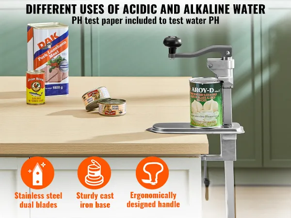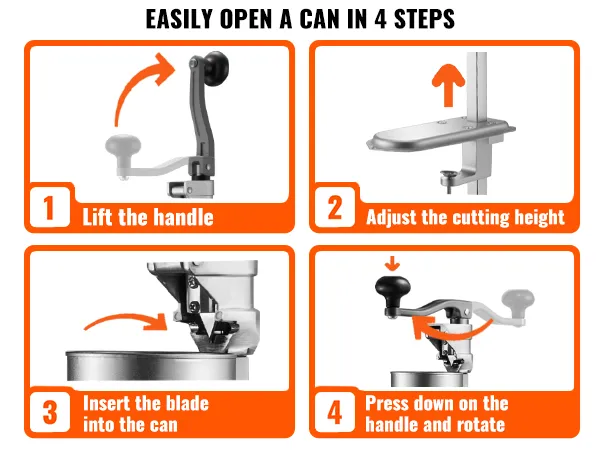 Fácil de usar: Para usar este resistente abrelatas, simplemente coloque la lata, ajuste la altura, baje la cuchilla y el mango, y gírelo. El mango ergonómico proporciona un agarre cómodo para un manejo suave