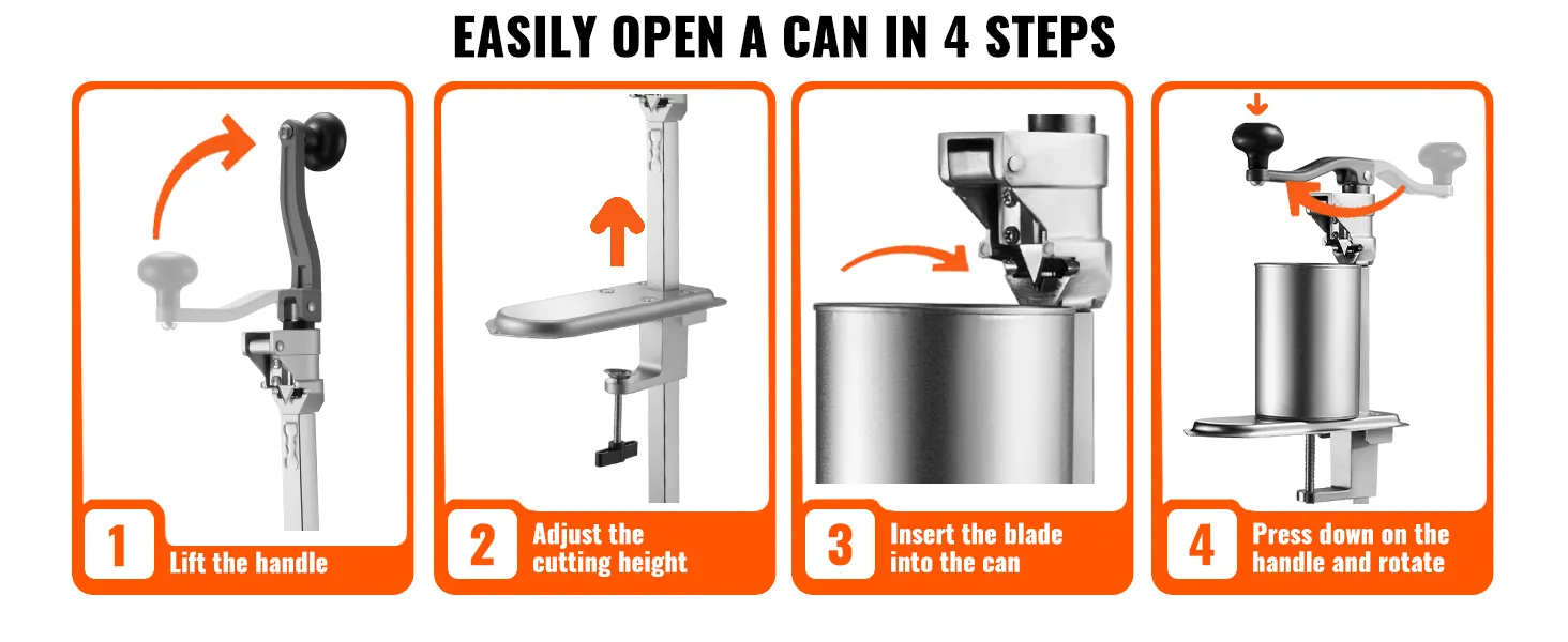 Este robusto abrelatas es increíblemente fácil de usar. Abre la lata en solo cuatro pasos. Es rápido y eficiente, y fácil de aprender incluso para principiantes.