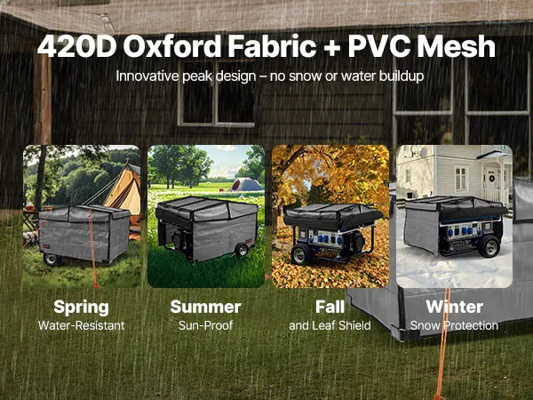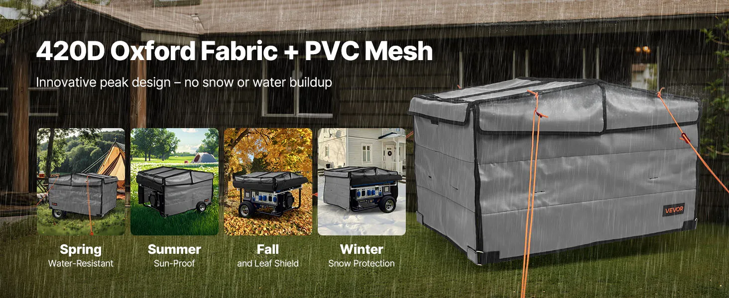 Tela Oxford impermeable: Fabricada con tela Oxford 420D resistente y reverso de malla de PVC, esta cubierta universal para generador es resistente al agua, la nieve, el polvo y el envejecimiento. Resistente a desgarros y a la intemperie, su diseño de techo puntiagudo evita la acumulación de nieve y agua