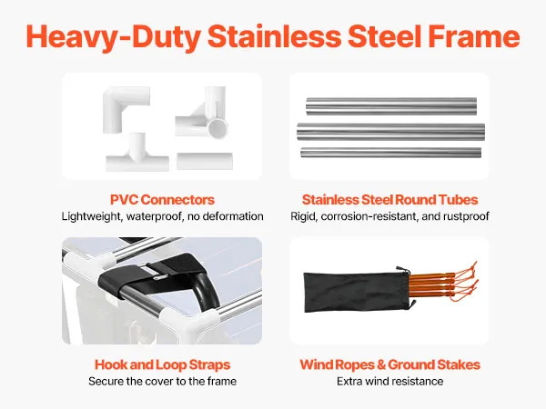 Marco reforzado: Fabricado con conectores de PVC y tubos de acero inoxidable, el marco de la cubierta del generador es ligero, impermeable y resistente a la corrosión. Las estacas de tierra y las cuerdas de viento añaden refuerzo adicional para evitar que se mueva o se vuele en condiciones adversas