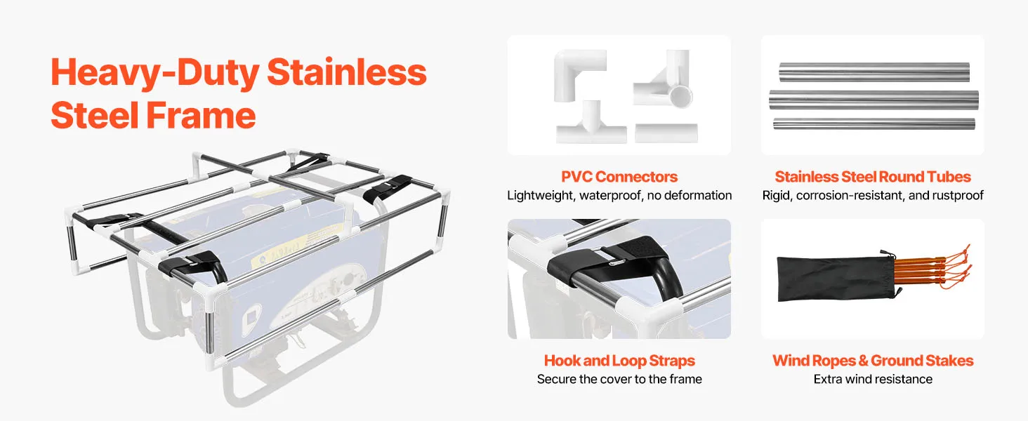 El armazón cuenta con tubos de acero inoxidable y conectores de PVC para mayor durabilidad y resistencia a impactos. Las correas sujetan firmemente la cubierta del generador portátil, mientras que las estacas de tierra y las cuerdas de viento aportan mayor estabilidad a prueba de viento.