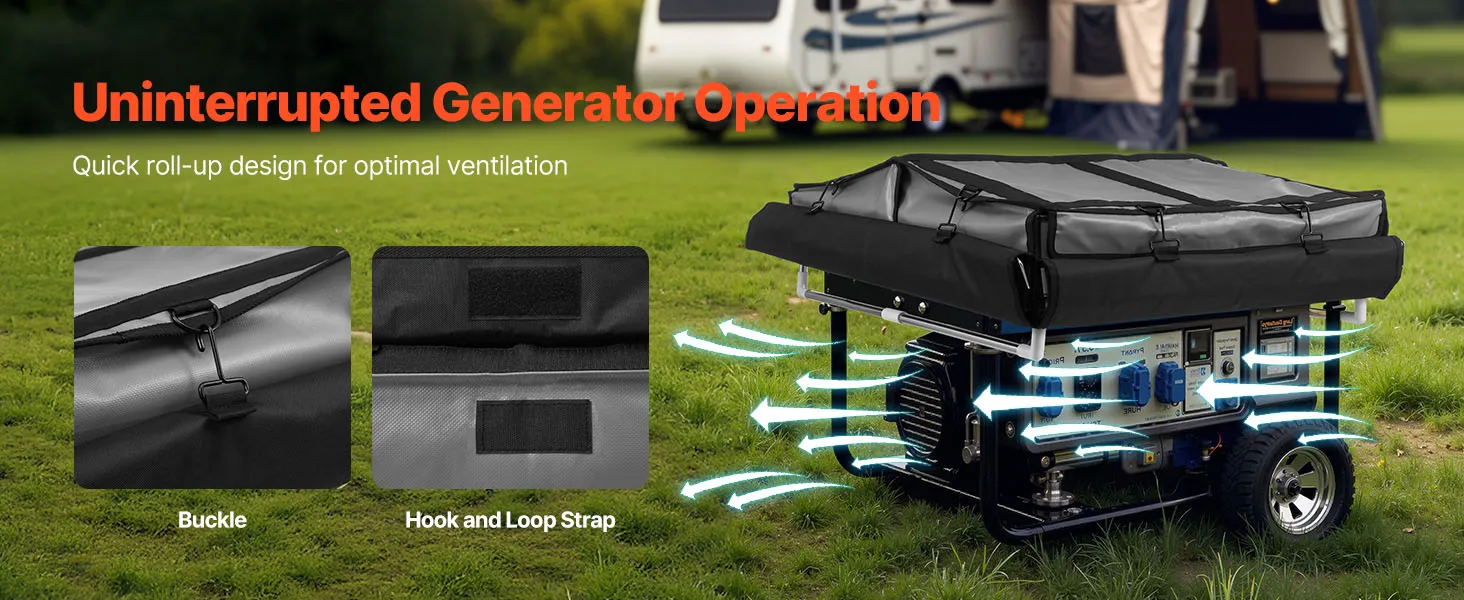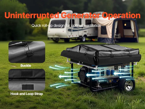Las solapas laterales se enrollan y se aseguran con correas y hebillas, lo que permite una óptima circulación del aire y disipación del calor. La cubierta de funcionamiento del generador lo mantiene fresco y funcionando eficientemente para una mayor vida útil.