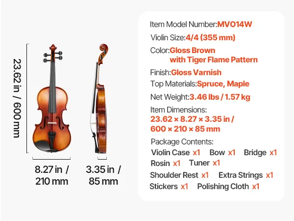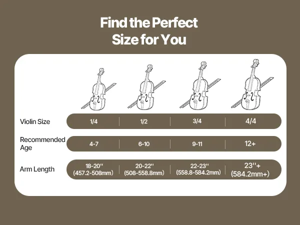 Violín 4/4: Este tamaño de violín es ideal para usuarios mayores de 12 años con una longitud de brazo de 584,2 mm (23 pulgadas o más). Es un instrumento ideal para principiantes o intérpretes, ideal para clases, presentaciones o práctica en casa