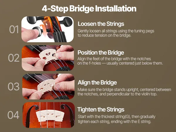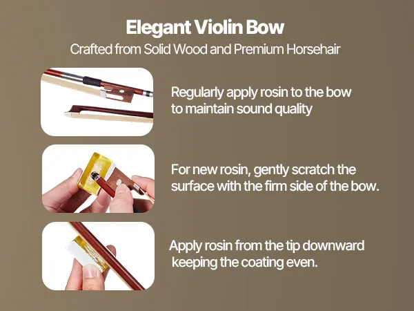 Set completo de violín: Incluye estuche, arco, puente, resina, afinador, almohadilla, cuerdas de repuesto, adhesivo y paño de pulido. ¡Olvídate de buscar accesorios adicionales! Simplemente abre el paquete, afina rápidamente, pule el arco con resina y empieza a tocar de inmediato