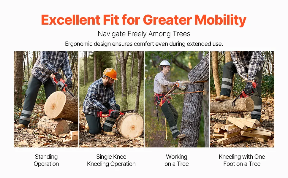 Alta comodidad: Diseñados ergonómicamente para un ajuste perfecto, estos livianos pantalones para motosierra permiten una mayor movilidad en varias posiciones de trabajo, mientras que el suave forro interior evita lesiones por desgaste durante el uso prolongado