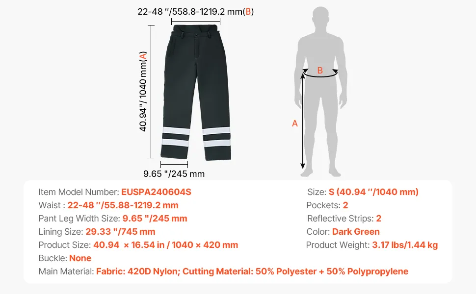 Cómodos de usar: Diseñados para ser versátiles, estos pantalones de motosierra vienen en varios tamaños con un cinturón ajustable adecuado para cinturas de 22 a 48 pulgadas (55,88 a 121,92 cm) y tienen una longitud de pierna completa de 40,94 pulgadas / 104 cm (desde la cintura hasta la parte superior del pie, no la longitud de la costura)