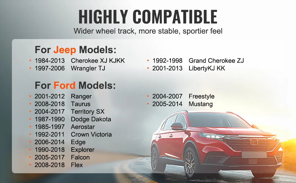 Estos espaciadores de rueda están diseñados para adaptarse perfectamente a muchos vehículos Jeep y Ford. Son compatibles con una variedad de modelos desde 1984 hasta 2018. Esto incluye los modelos Jeep Cherokee, Wrangler, Grand Cherokee y Liberty. Los automóviles Ford también incluyen los modelos Ranger, Taurus, Territory, Aerostar, Crown Victoria, Edge, Explorer, Falcon, Flex y Freestyle. El ajuste preciso garantiza que estos espaciadores funcionen a la perfección con las especificaciones de su vehículo. Siempre verifique la compatibilidad del manual de su automóvil antes de comprarlo. Estos espaciadores han sido diseñados para no requerir modificaciones, lo que los hace capaces de adaptarse a muchos conductores fácilmente.