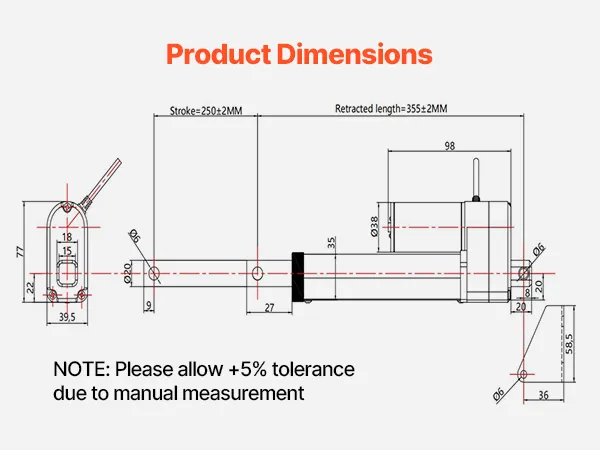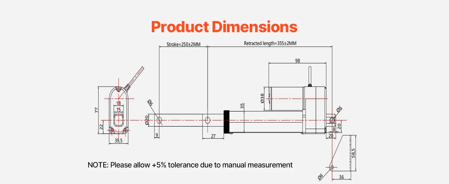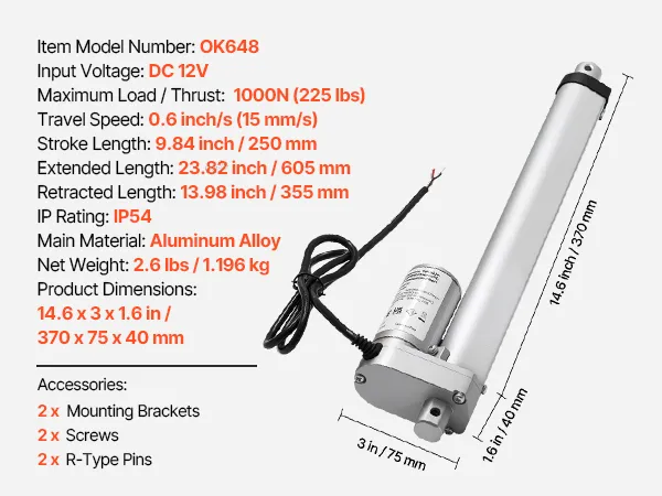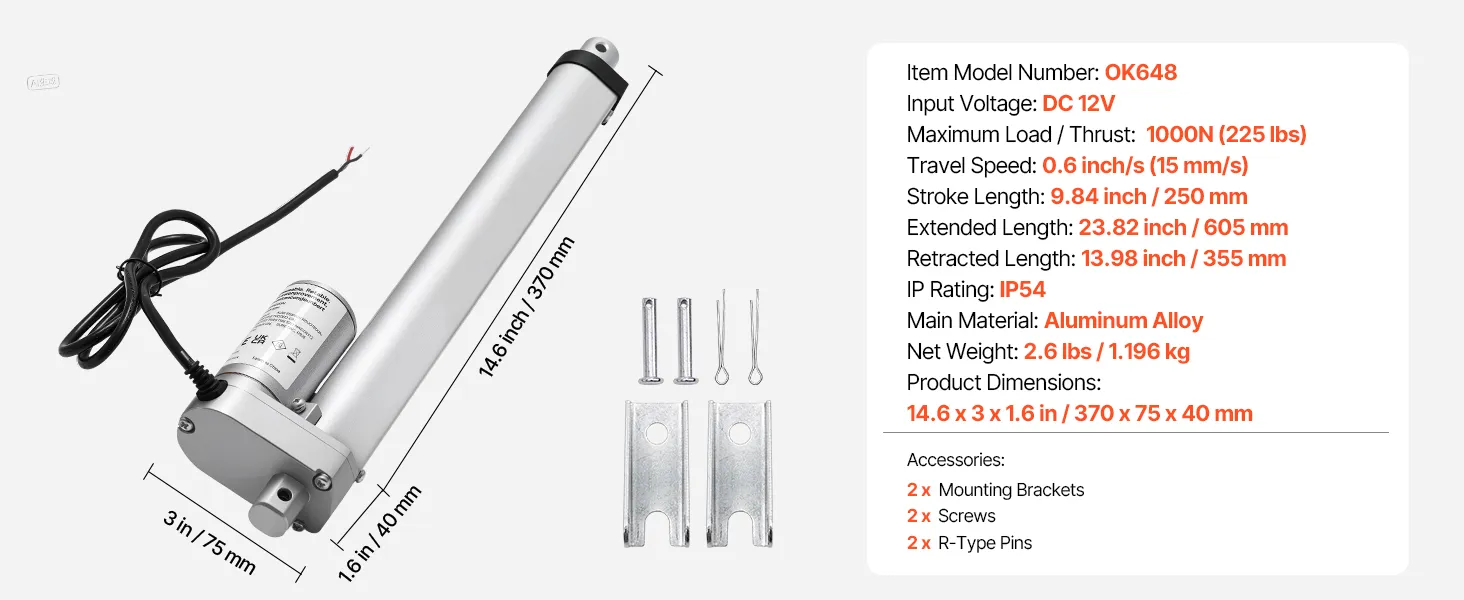 Especificaciones clave: Velocidad de desplazamiento: 15 mm/s; Longitud de carrera: 250 mm; Longitud extendida: 605 mm; Longitud retraída: 355 mm; Consumo de corriente: 5 amperios; Voltaje de entrada: 12 V CC; Ciclo de trabajo: 25 %