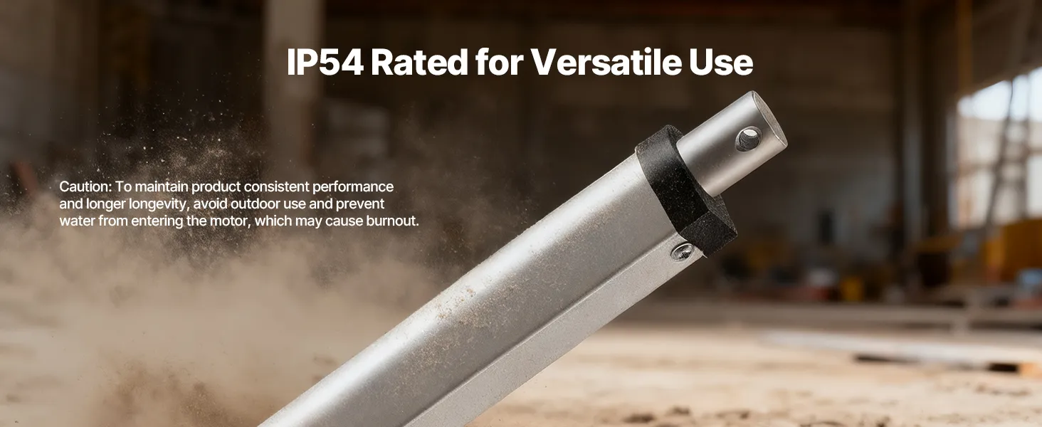 Grado de protección IP54: Gracias a su grado de protección IP54 y a su robusta carcasa de aleación de aluminio, este actuador lineal ofrece una larga vida útil en interiores.(Precaución: Para un rendimiento constante y una mayor vida útil, evite el uso en exteriores y evite que entre agua en el motor y lo queme)
