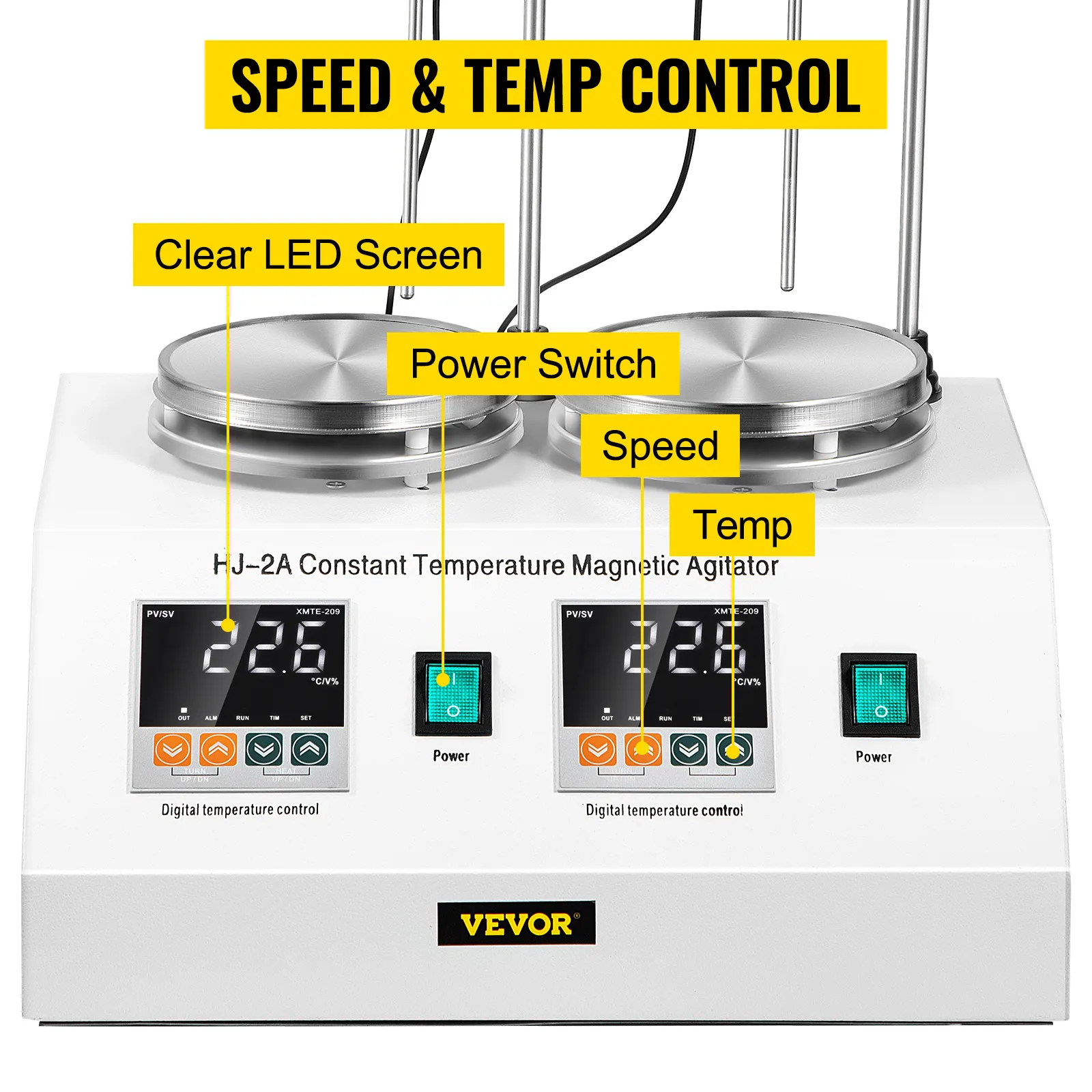 Pantalla LED grande, muestra claramente la temperatura de calentamiento preestablecida y en tiempo real, velocidad de agitación (0-2000 rpm). Ambas unidades admiten el ajuste de velocidad y temperatura con 4 botones.