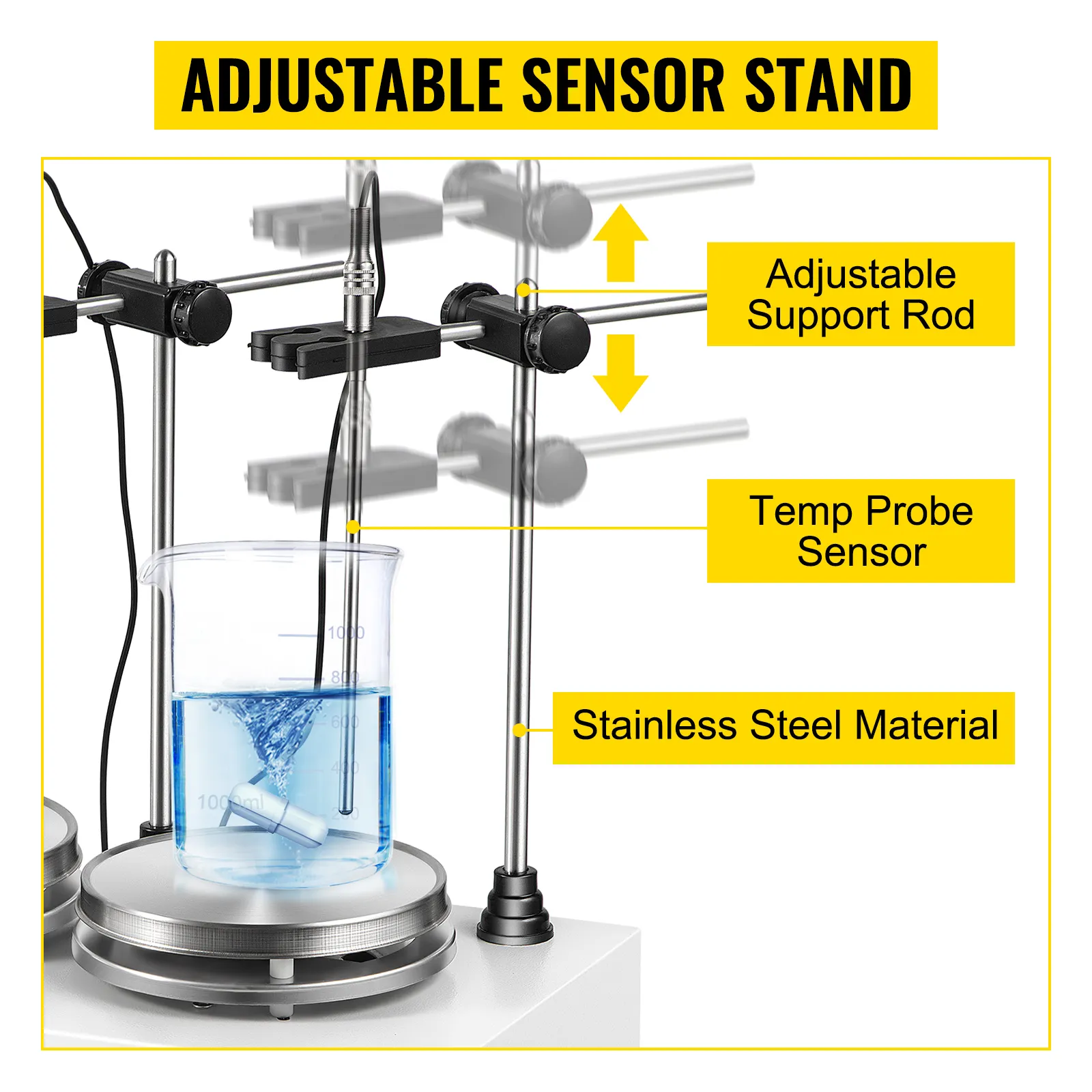 Abrazadera de acero inoxidable de primera calidad, fije la sonda u otro equipo de laboratorio firmemente. También es ajustable en altura para adaptarse a diferentes necesidades. Gran ayuda para experimentos.