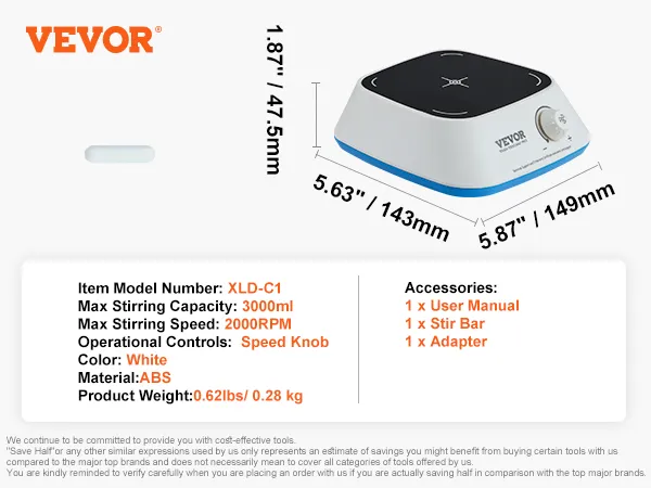 El mezclador magnético VEVOR viene con un conjunto completo de accesorios, que incluye 1 manual de usuario, 1 barra agitadora y 1 adaptador, lo que lo hace adecuado para diversos experimentos.