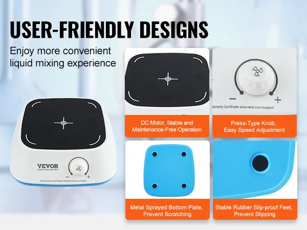 Este agitador magnético tiene características fáciles de usar, como un motor de CC para un funcionamiento estable y sin mantenimiento, un botón de presionar y girar para un fácil ajuste de la velocidad y una base de goma antideslizante.