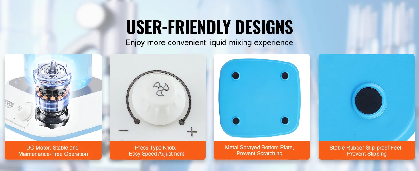 Cuenta con un potente motor que proporciona velocidades de agitación estables y ajustables. La perilla de velocidad ajustable en la parte inferior permite que la rotación en el sentido de las agujas del reloj aumente la velocidad.