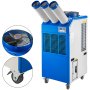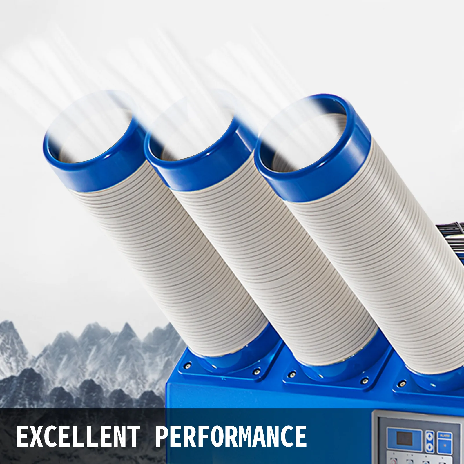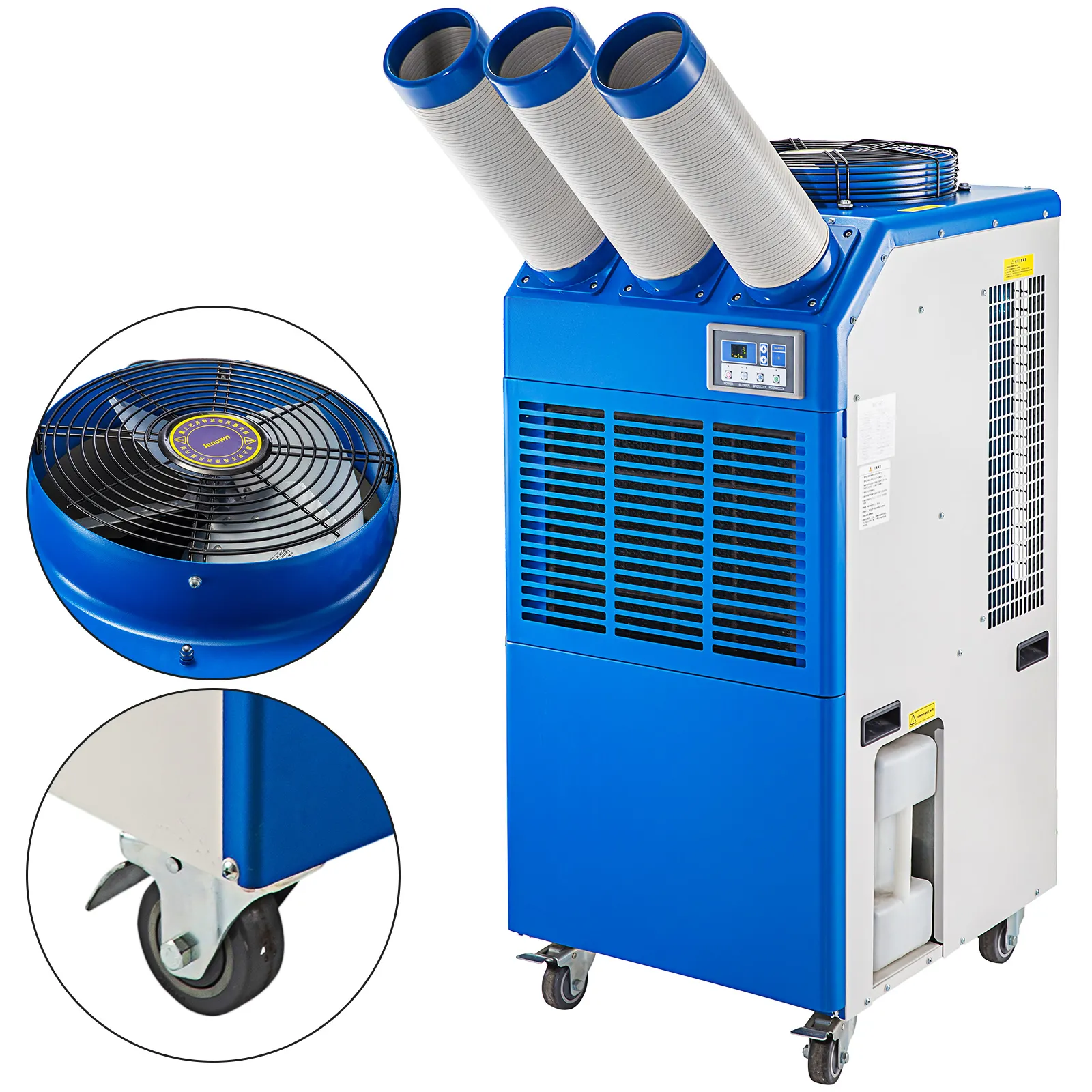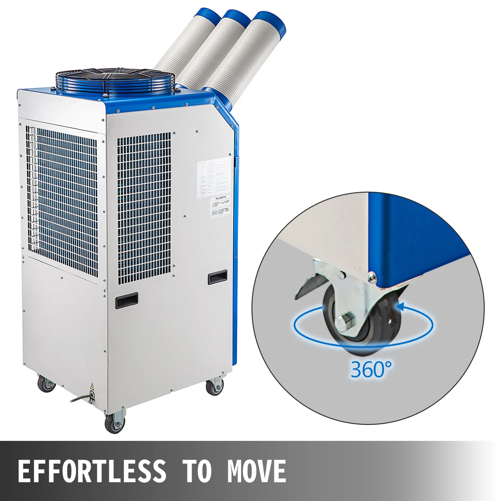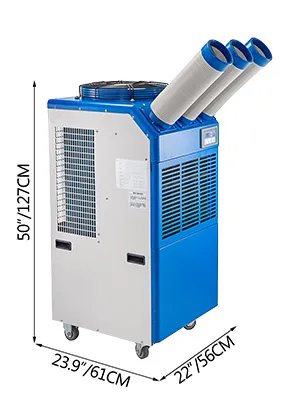 Nuestro aire acondicionado portátil tiene dos conductos de aire giratorios. Capacidad de refrigeración: 22.000 BTU/h, volumen de aire: 400 m³/h puede mantenerlo fresco todo el día; las ruedas giratorias lo hacen rodar fácilmente en cualquier espacio que necesite enfriarse rápidamente, y un gran tanque de agua para el drenaje continuo.