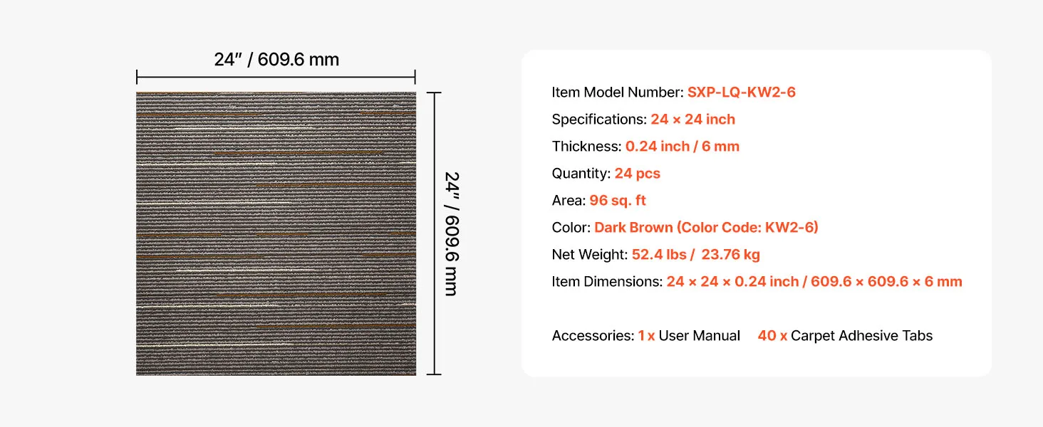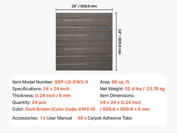 VEVOR Losetas de Alfombra, 609,6 x 609,6 x 6 mm, Suelo de Moqueta Modular de 9 m², Fácil de Instalar y Reemplazar, para Apartamentos, Oficinas, Propiedades de Alquiler, Marrón Oscuro, 24 uds