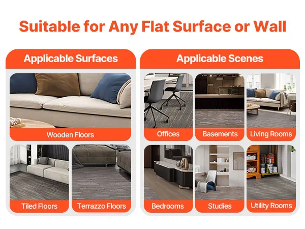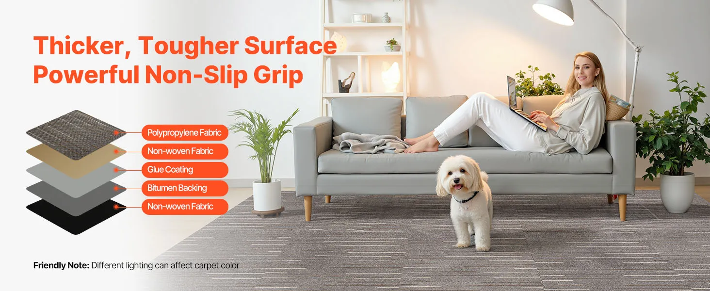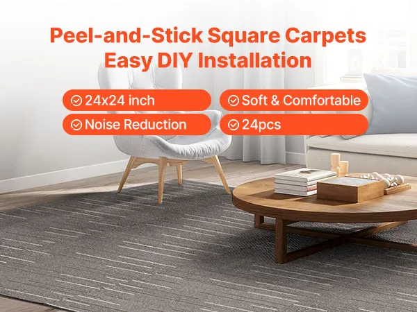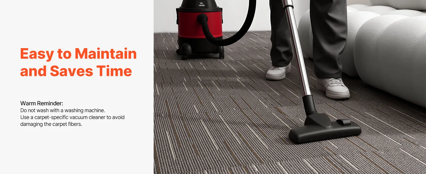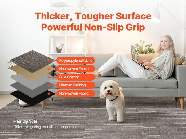 Antideslizantes y duraderas: Estas losetas de alfombra cuentan con un reverso de asfalto antideslizante que proporciona estabilidad, resistencia y resistencia a la abrasión. Son ideales para zonas de alto tránsito, como oficinas, pasillos o espacios de alquiler