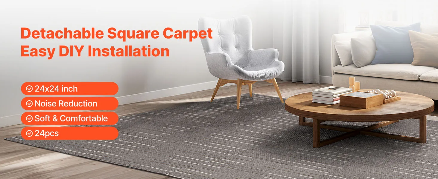 Juego de losetas de alfombra reemplazables: Este juego completo contiene 24 losetas de alfombra de 609,6 x 609,6 mm. Una vez instaladas, cubren una superficie total de 9 m². Gracias a su diseño sencillo, la instalación es rápida y sencilla, incluso para una sola persona