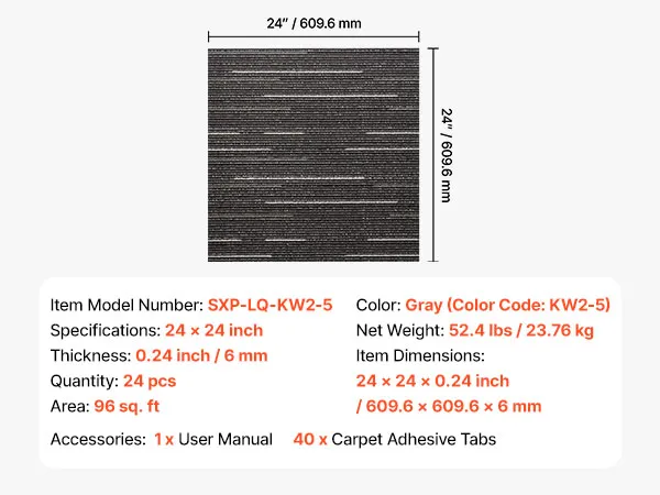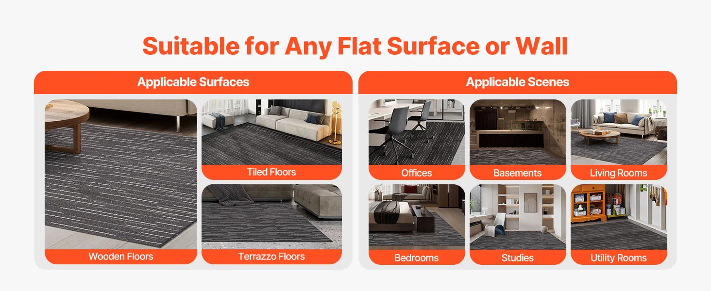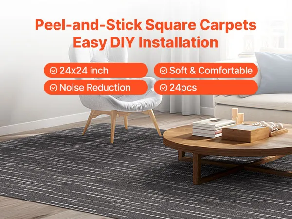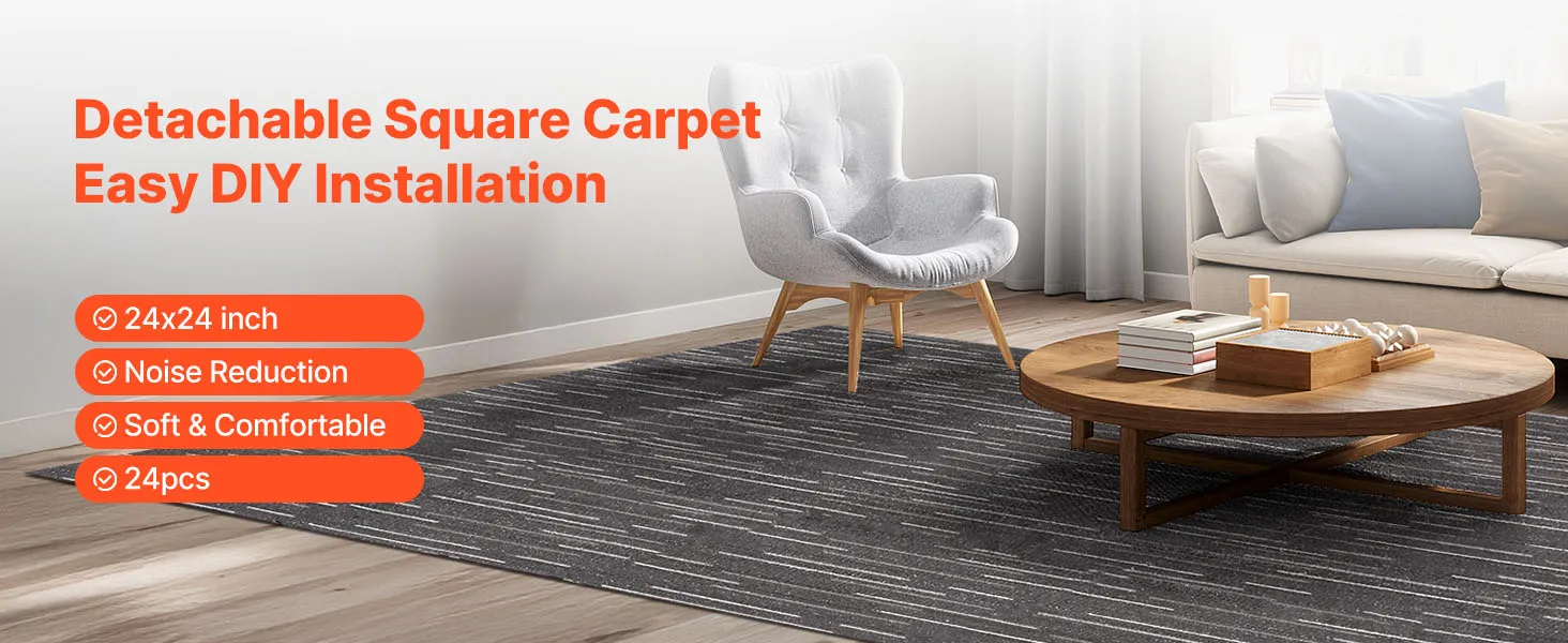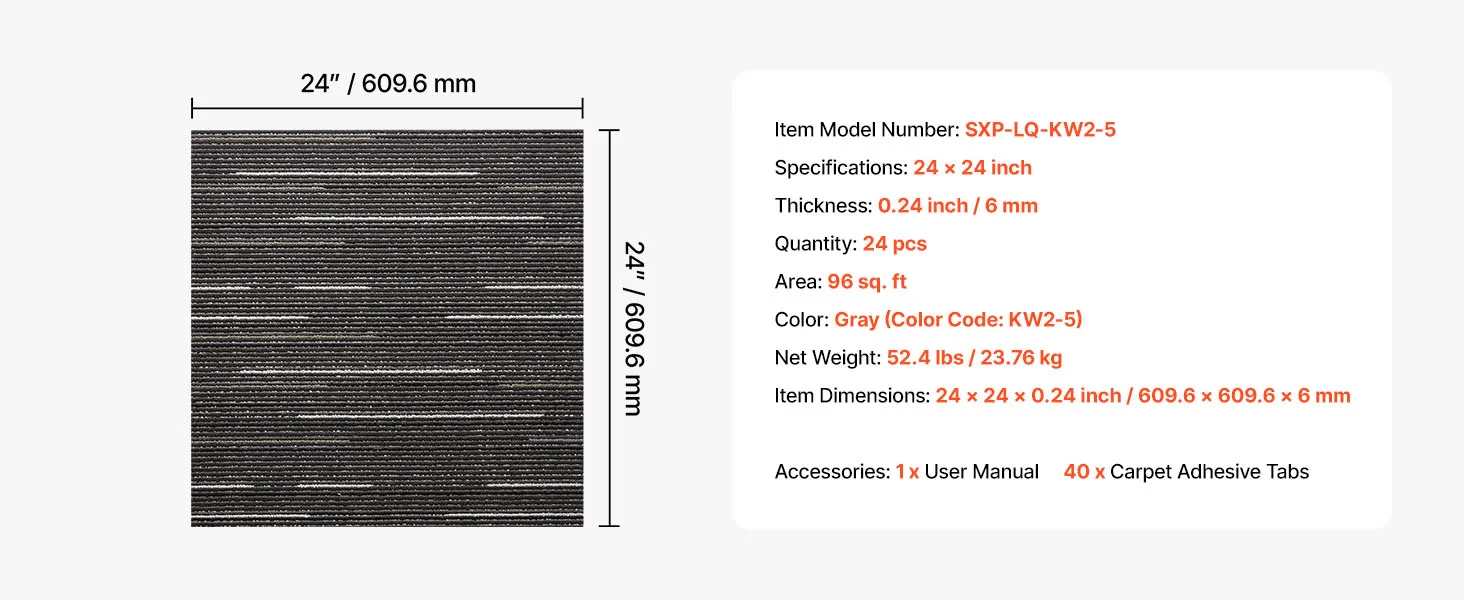 Juego de losetas de alfombra reemplazables: Este juego completo contiene 24 losetas de alfombra de 609,6 x 609,6 mm. Una vez instaladas, cubren una superficie total de 9 m². Gracias a su diseño sencillo, la instalación es rápida y sencilla, incluso para una sola persona