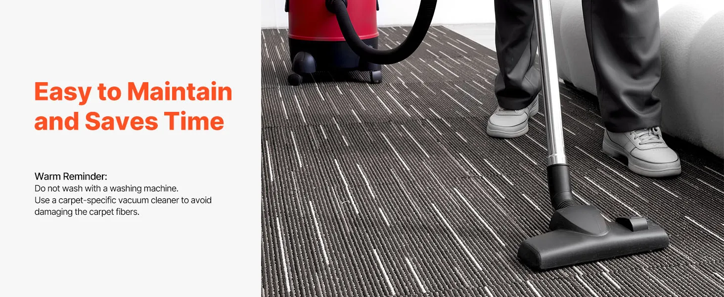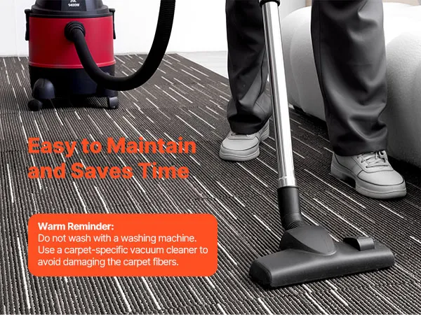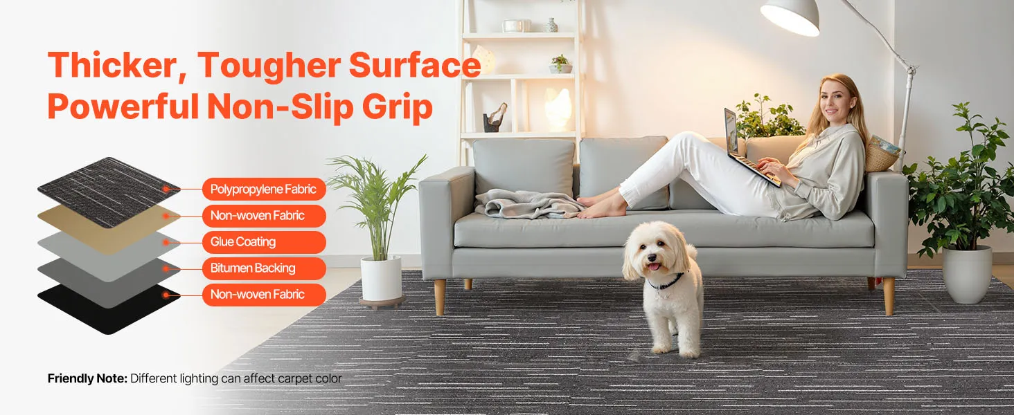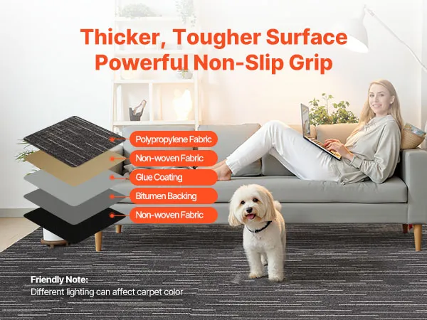 Antideslizantes y duraderas: Estas losetas de alfombra cuentan con un reverso de asfalto antideslizante que proporciona estabilidad, resistencia y resistencia a la abrasión. Son ideales para zonas de alto tránsito, como oficinas, pasillos o espacios de alquiler