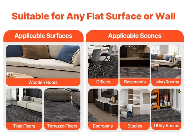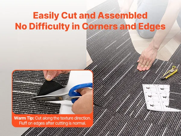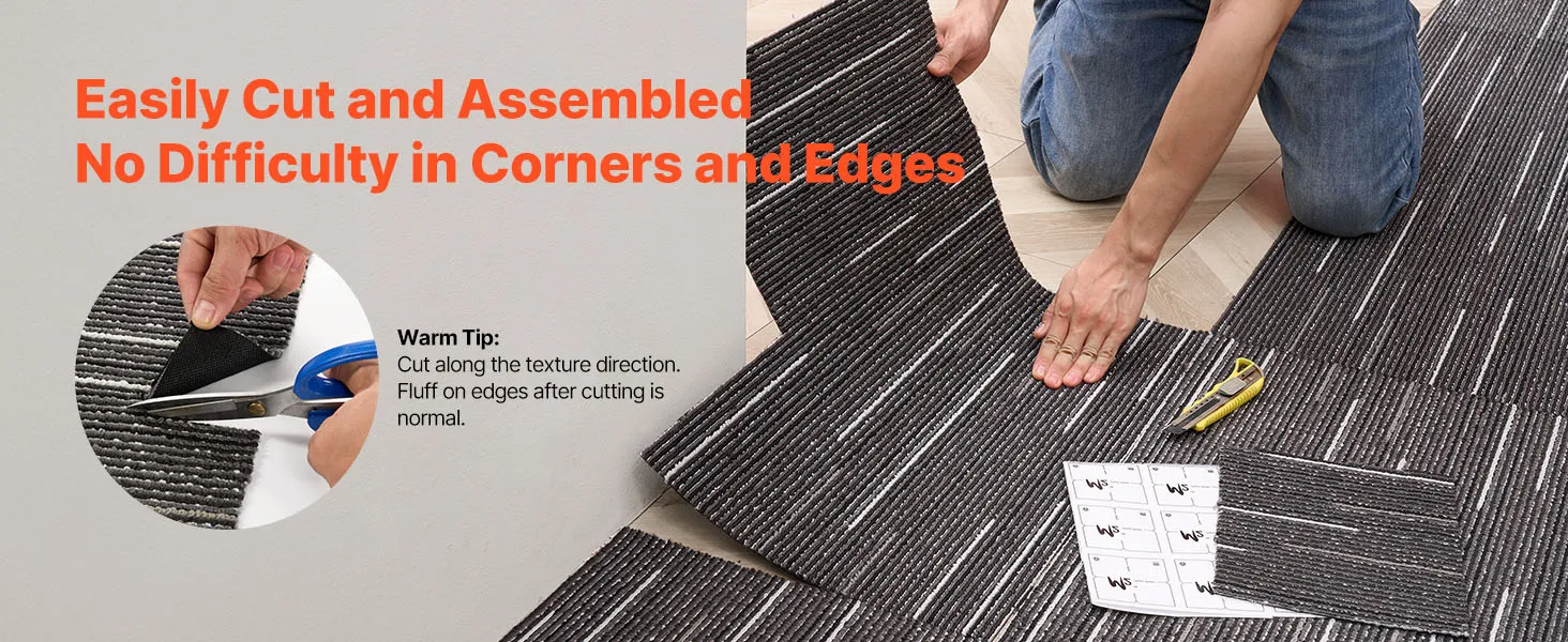Cada loseta de alfombra se puede cortar libremente en cualquier forma y tamaño, lo que permite cubrir fácilmente áreas irregulares y cubrir toda la habitación sin problemas.