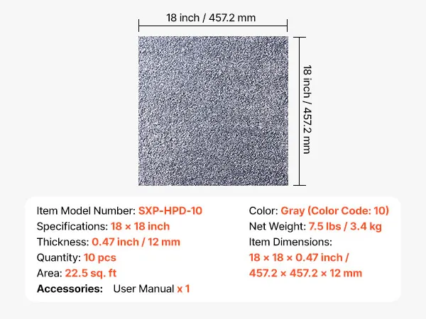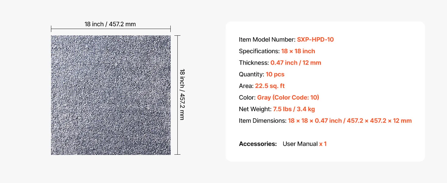 Juego de losetas de alfombra: Este juego completo contiene 10 losetas de alfombra de 457,2 x 457,2 mm. Una vez ensambladas, cubren una superficie de 2,0 m². Su diseño modular permite una instalación rápida, que puede ser realizada fácilmente incluso por una sola persona