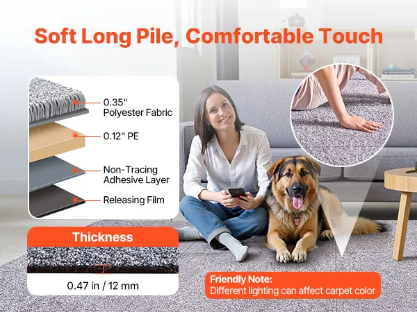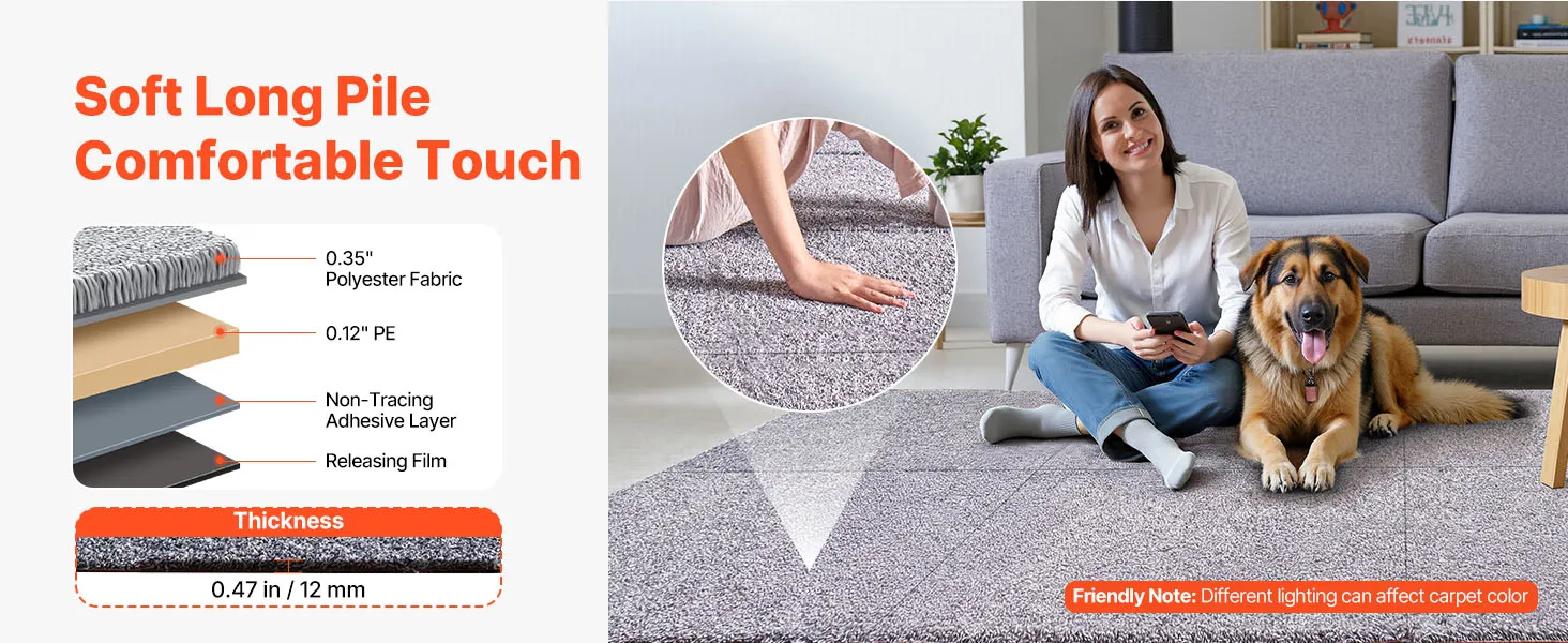 Suave y cómoda: Cada loseta de alfombra autoadhesiva presenta una construcción multicapa. La superficie afelpada de 0,89 cm de grosor, combinada con una base de espuma viscoelástica de 0,30 cm de grosor, proporciona una sensación suave y acolchada al pisar