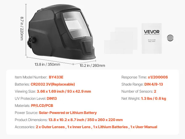 VEVOR Casco de Soldadura, con Oscurecimiento Automático Solar, Color Verdadero, Visión Amplia, 93 x 42,9 mm, con 2 Sensores Arco, Tono DIN 4/9-13, a Soldadura TIG, MIG y Arco, Amolado, Negro Mate