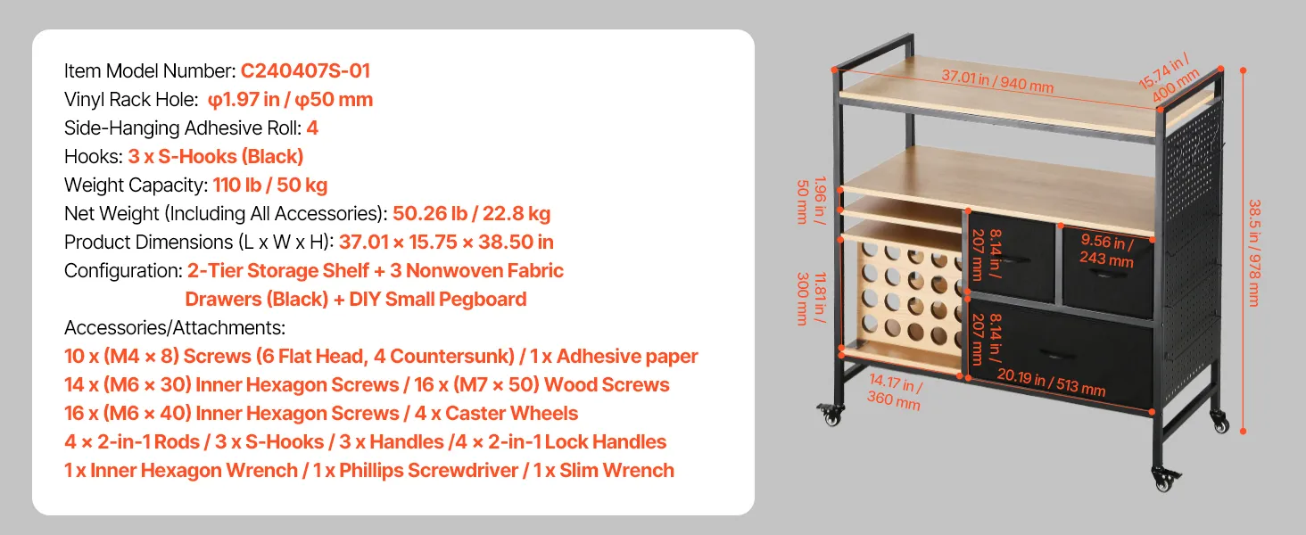 Estante de almacenamiento de 2 niveles + 3 cajones de tela no tejida (negro) + tablero perforado pequeño para bricolaje