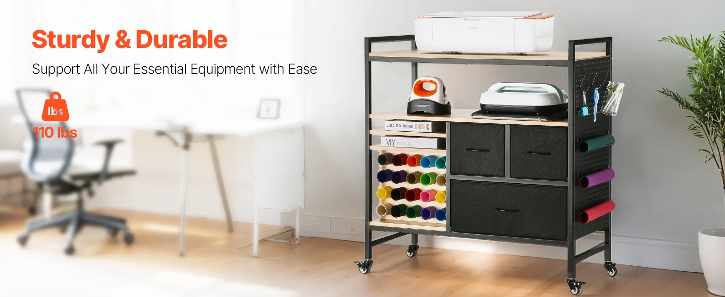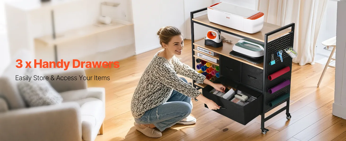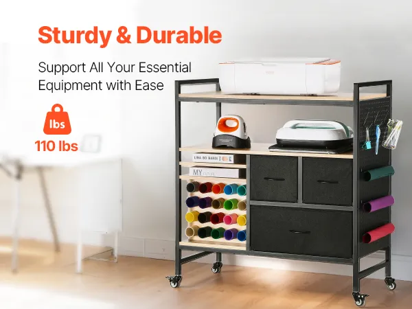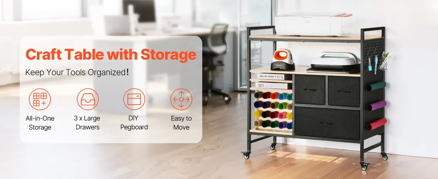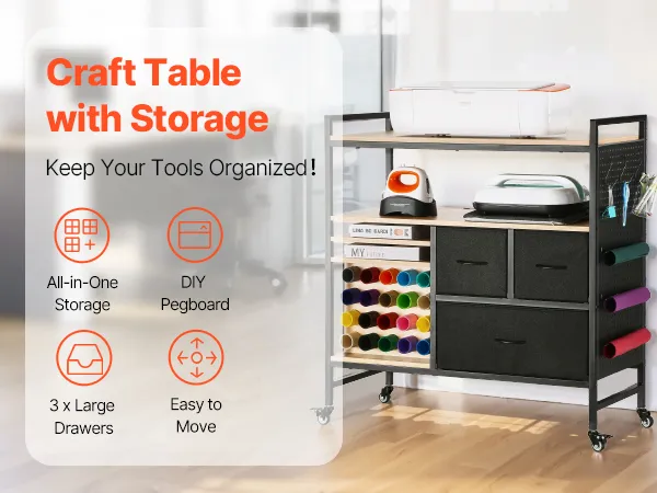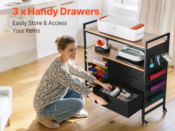 VEVOR Carrito de Manualidades con Ruedas y Mesa de Almacenamiento, Mesa Plegable con Lados Plegables, 20 Soportes para Rollos de Vinilo y 3 Cajones, Compatible con Máquinas, Negro