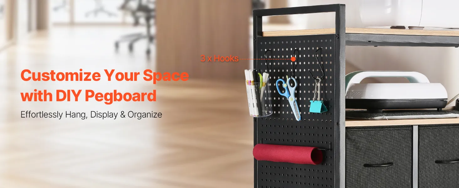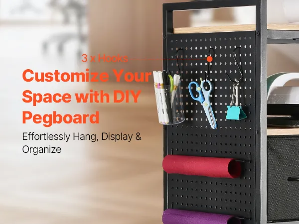 Almacenamiento todo en uno: Nuestro carrito de manualidades con ruedas y mesa de almacenamiento satisface todas sus necesidades de almacenamiento. Tres cajones espaciosos brindan un almacenamiento discreto y ordenado para papel y otros suministros pequeños para manualidades. El tablero perforado lateral le permite colgar y acceder fácilmente a varias herramientas