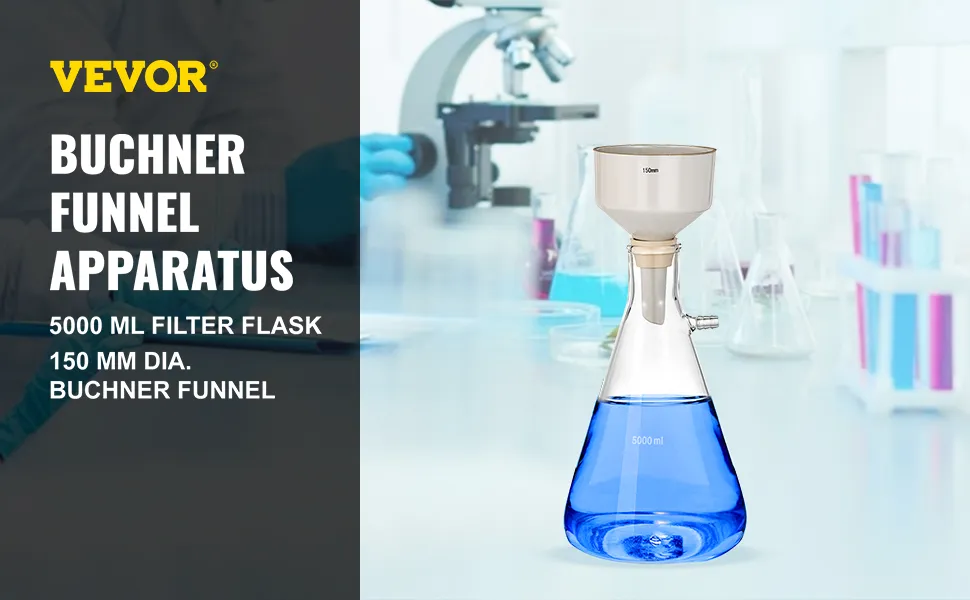 Este kit de embudo Buchner está hecho de vidrio de borosilicato de alta calidad con alta resistencia, fácil para montar y desmontar con un matraz de filtración al vacío de 5.000 ml, un embudo Buchner de 5,91" / 150 mm de diámetro y un tapón de goma. El embudo del filtro al vacío tiene excelente rendimiento de sellado y una buena perspectiva, ampliamente aplicada en análisis químicos e investigación científica para filtrar partículas y bacterias.