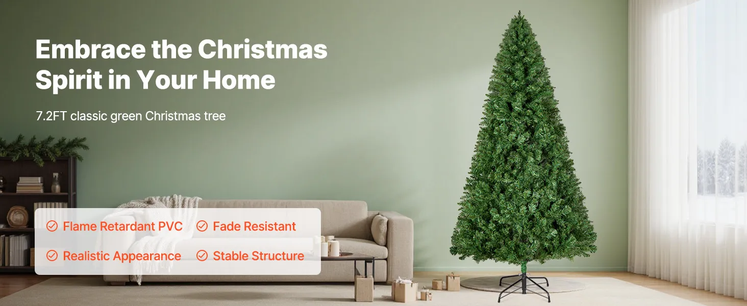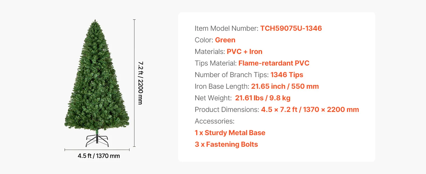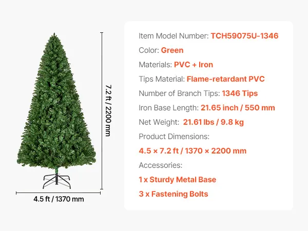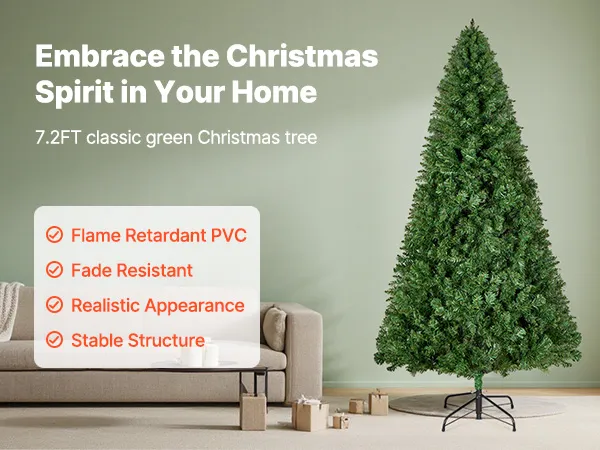 VEVOR Árbol de Navidad Artificial, Decoración de Interiores con 1346 Ramas de PVC Ignífugo y Base de Metal, Ideal para Salón, Dormitorio, Centro Comercial, Parque y Oficina, Verde, 1370 x 2200 mm