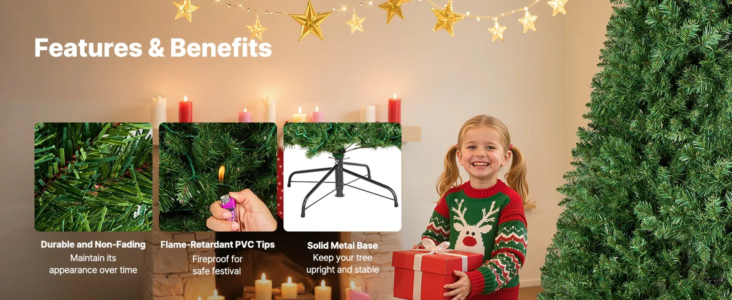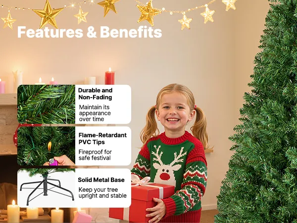 Hecho para durar: Fabricado con un tronco robusto y ramas de PVC ignífugo, nuestro árbol de Navidad artificial es duradero y resistente. Sujeto a una robusta base de metal, se mantiene firme y alegrará sus celebraciones navideñas año tras año