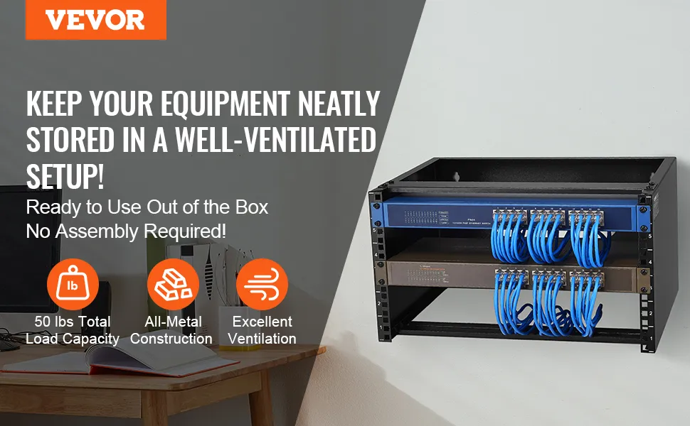 Nuestro rack de montaje en pared cuenta con un diseño de poste estabilizador doble y una estructura de metal sólida que soporta hasta 50 lb (22,7 kg) para mantener su equipo seguro y organizado. Con accesorios de montaje completos, puede asegurar fácilmente los dispositivos de red en el rack.