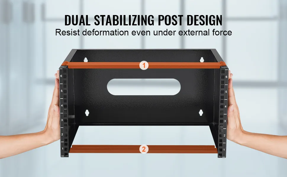 El diseño de poste estabilizador doble de nuestro rack de red de montaje en pared reduce las vibraciones y el movimiento, lo que garantiza que su equipo de red permanezca montado de forma segura y estable durante el funcionamiento.