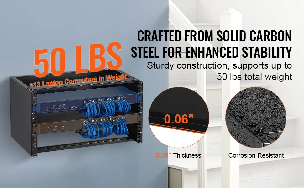 Resistente y duradero: fabricado con acero al carbono Q235 de primera calidad con un grosor resistente de 1,5 mm (0,06 in), este rack de red para montaje en pared soporta hasta 22,68 kg (50 lb), lo que garantiza que su equipo se mantenga estable y seguro, incluso con cargas pesadas. ¡Dígale adiós a los tambaleos y las inclinaciones!
