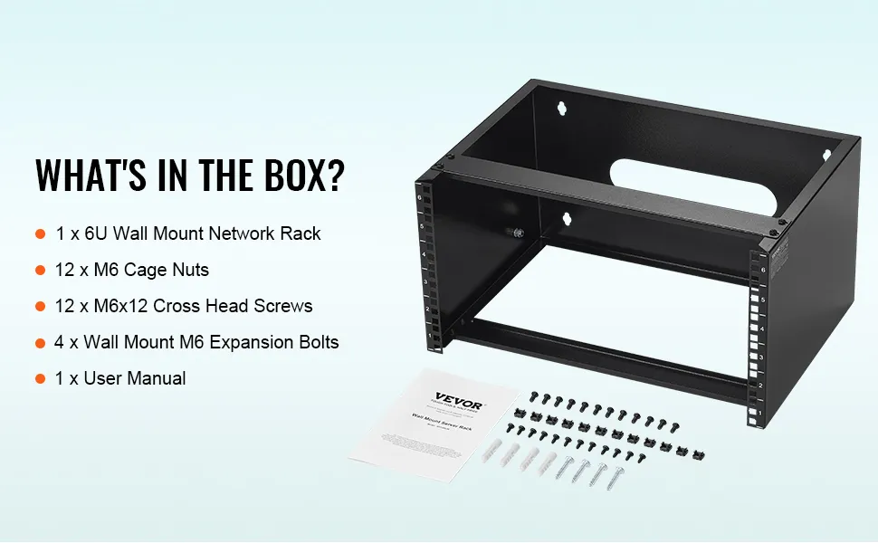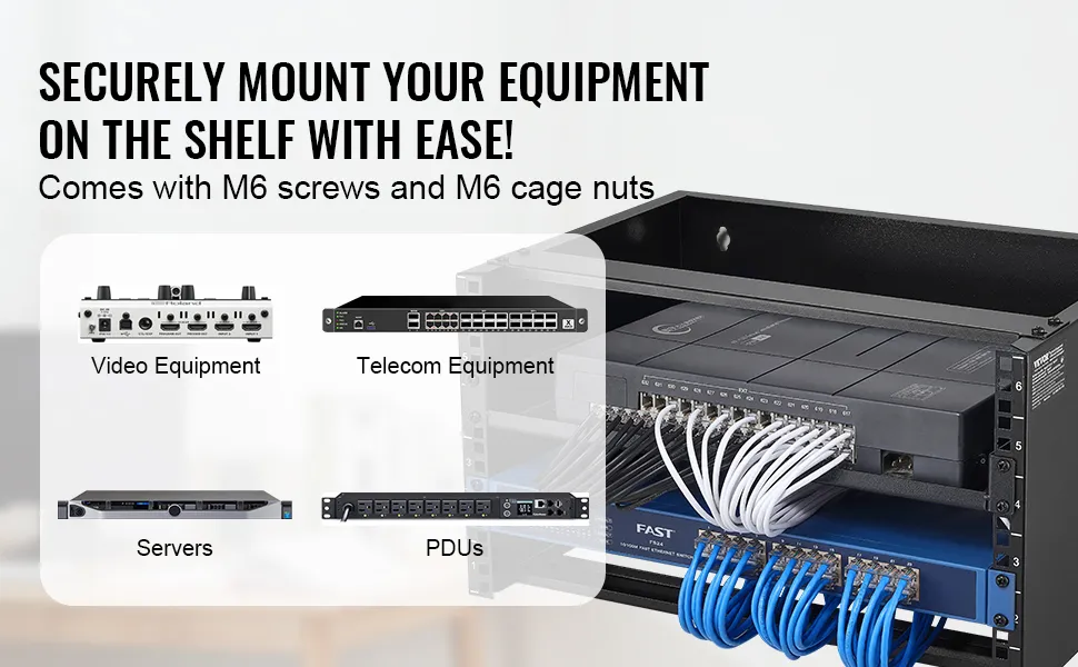 Equipado con tornillos M6 y tuercas enjauladas, puede montar directamente conmutadores, cortafuegos y otros dispositivos de red en nuestro rack de red. ¡Organice su equipo con facilidad y mantenga su espacio ordenado y prolijo!