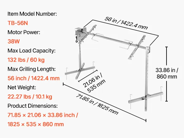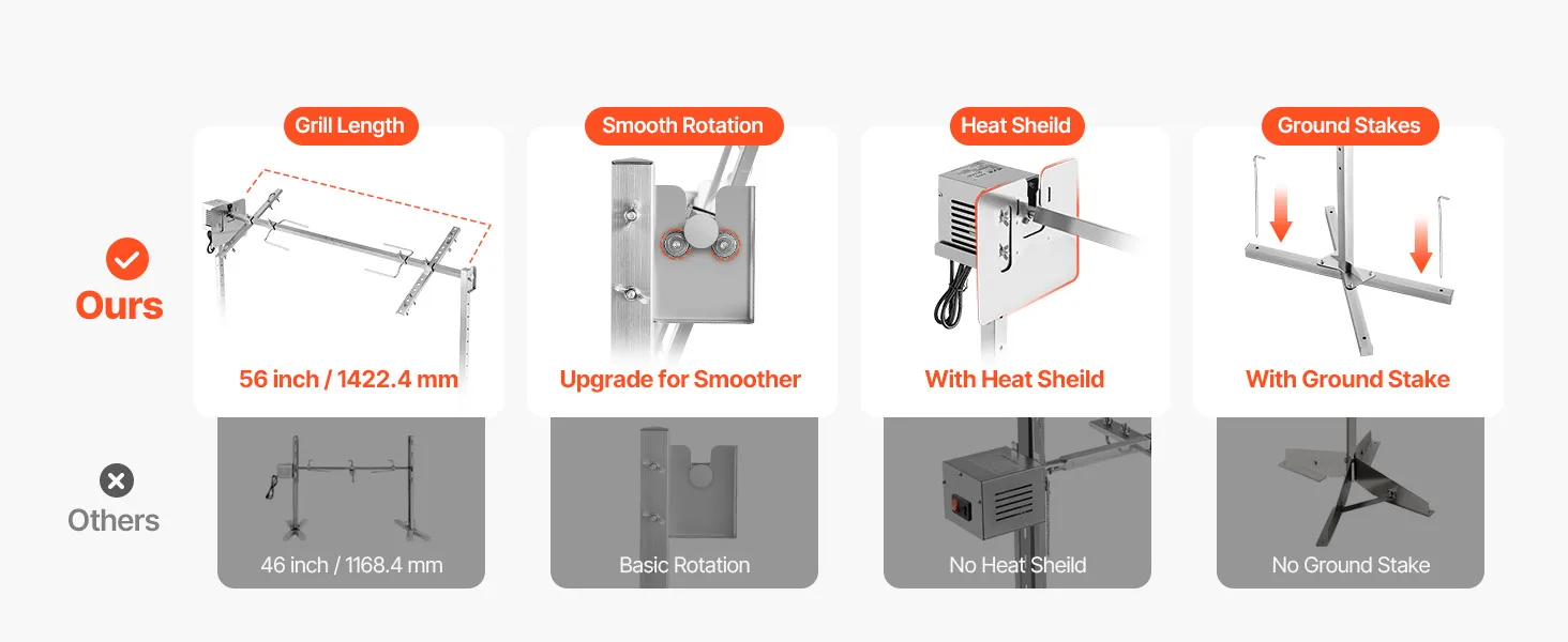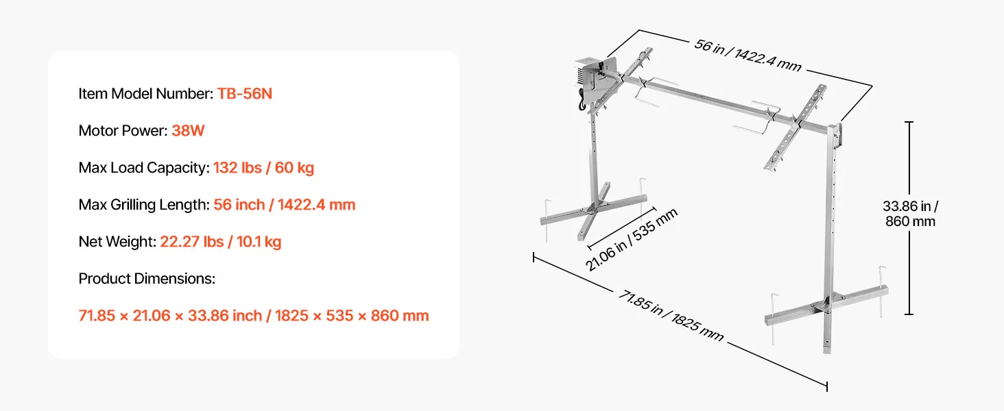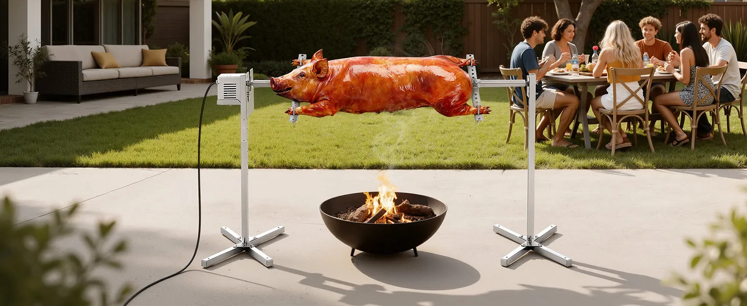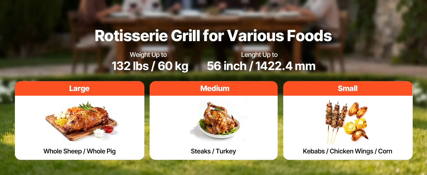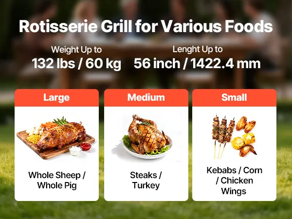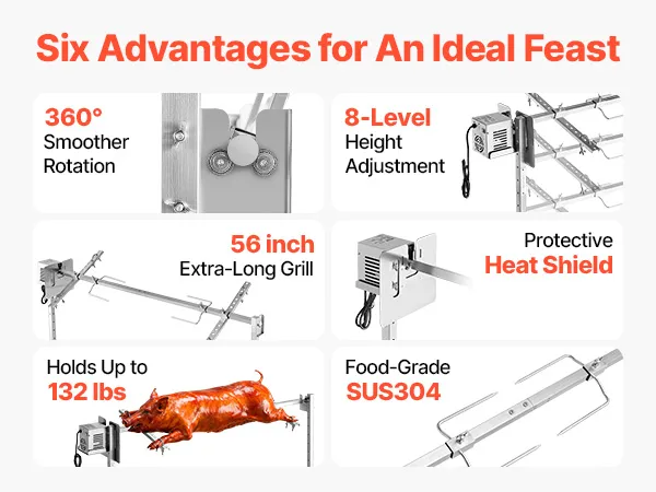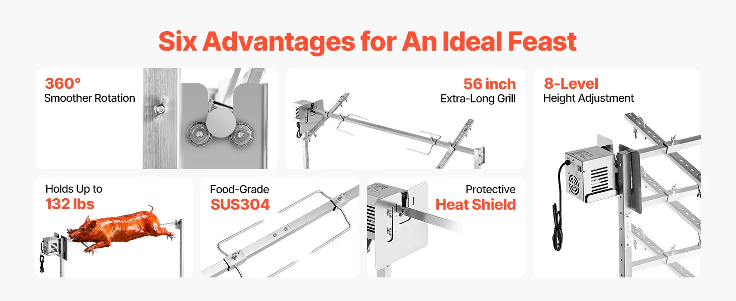 Gran capacidad: Diseñado para soportar hasta 60 kg, el marco de 1422,4 mm de este asador giratorio permite cocinar cerdos, corderos, pavos y más. Ideal para preparar comidas abundantes y cocinadas uniformemente que impresionarán a familiares y amigos en cualquier reunión