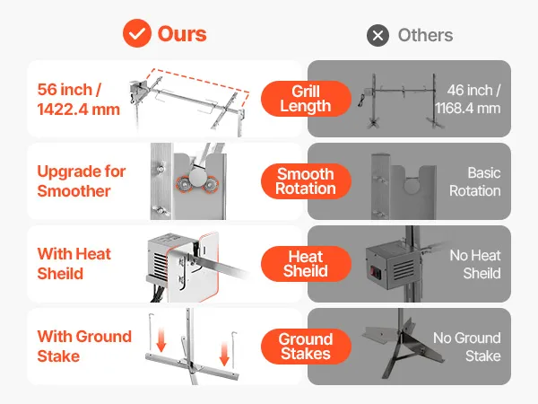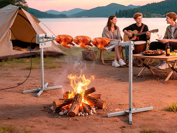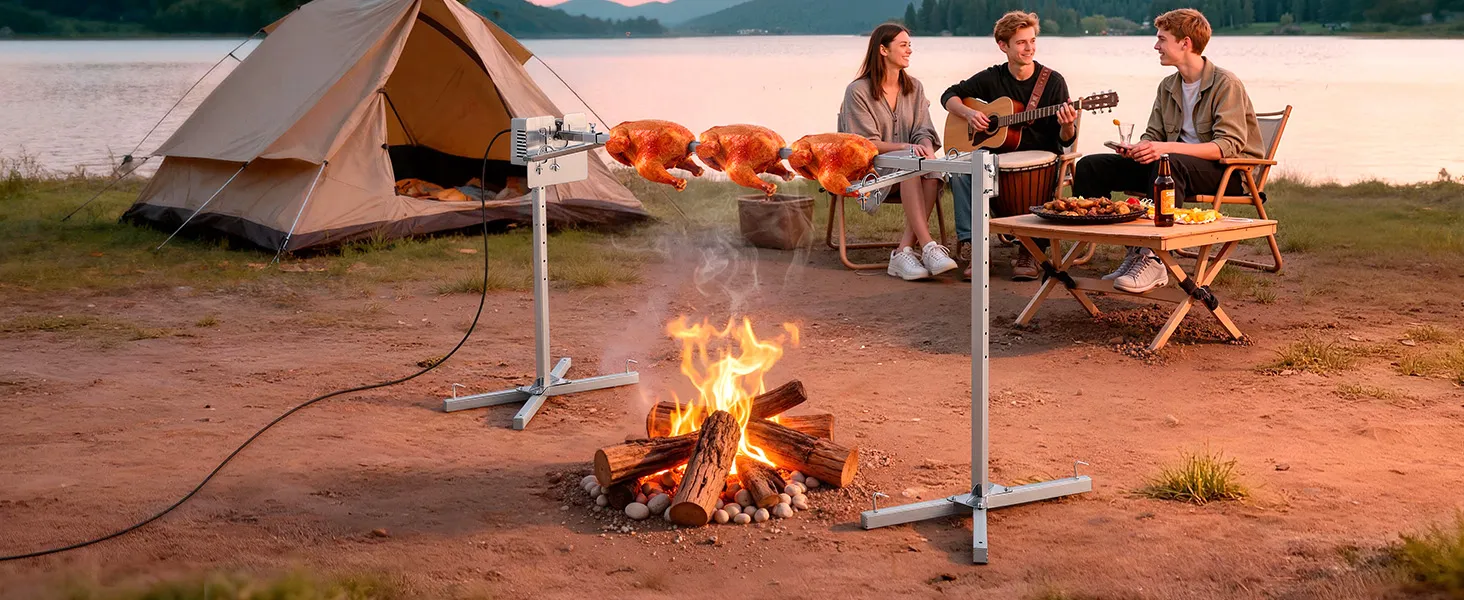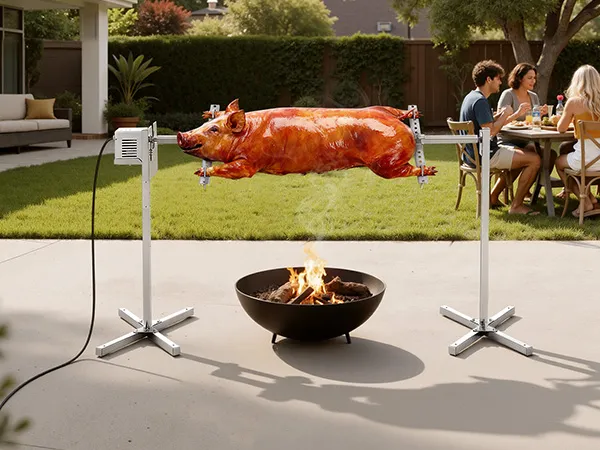 Nuestro asador giratorio cuenta con motor y ventilador de 38 W permiten una rotación suave de 360°, soportando hasta 60 kg de carne. 8 niveles de altura proporcionan un control preciso del calor. Las horquillas de acero inoxidable SUS304 y la estructura de acero inoxidable garantizan durabilidad.