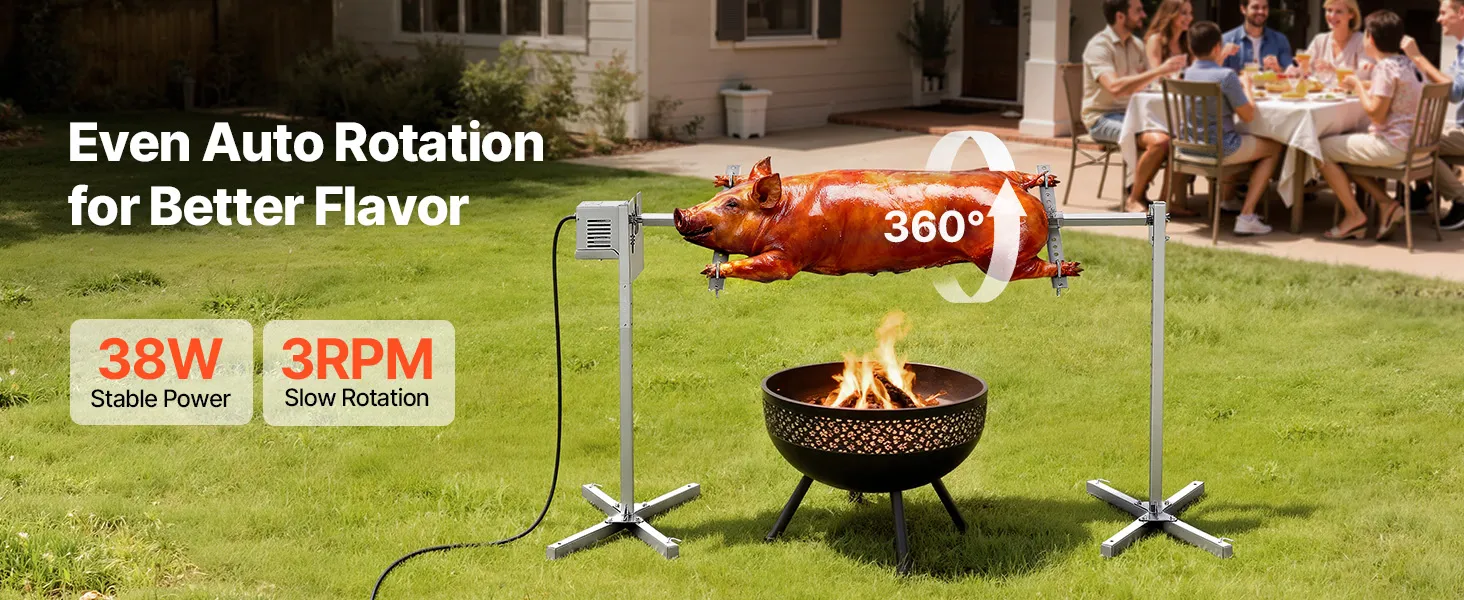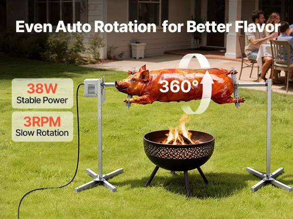 Rotación suave de 360°: Disfrute de una rotación suave con este kit de asador giratorio, impulsado por un motor de 38 W a 3 RPM. Los rodamientos dobles reducen el esfuerzo del motor, mientras que el ventilador de refrigeración mejorado y la cubierta protectora mantienen la unidad funcionando de manera eficiente para lograr una cocción uniforme
